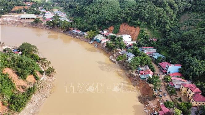 Nhiều hộ ven sông Chảy, thuộc xã Phúc Khánh, huyện Bảo Yên, tỉnh Lào Cai bị hư hỏng hoặc mất một phần nhà do dòng nước lũ làm lún, sụt đất ven sông. Ảnh: Hoàng Hiếu/TTXVN