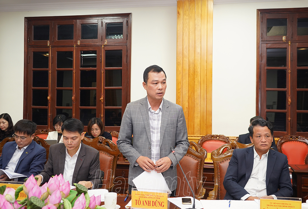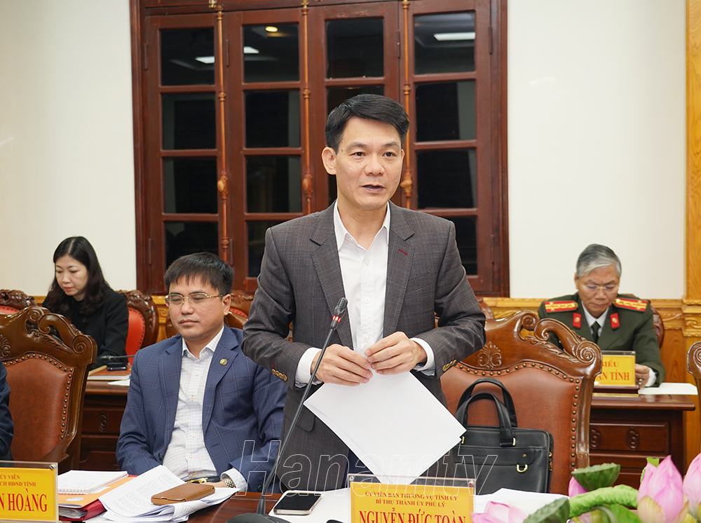 Đại tá Tô Anh Dũng, Ủy viên BTV Tỉnh ủy, Giám đốc Công an tỉnh phát biểu tại hội nghị.Đồng chí Nguyễn Đức Toàn, Ủy viên BTV Tỉnh ủy, Bí thư Thành ủy Phủ Lý phát biểu tại hội nghị.