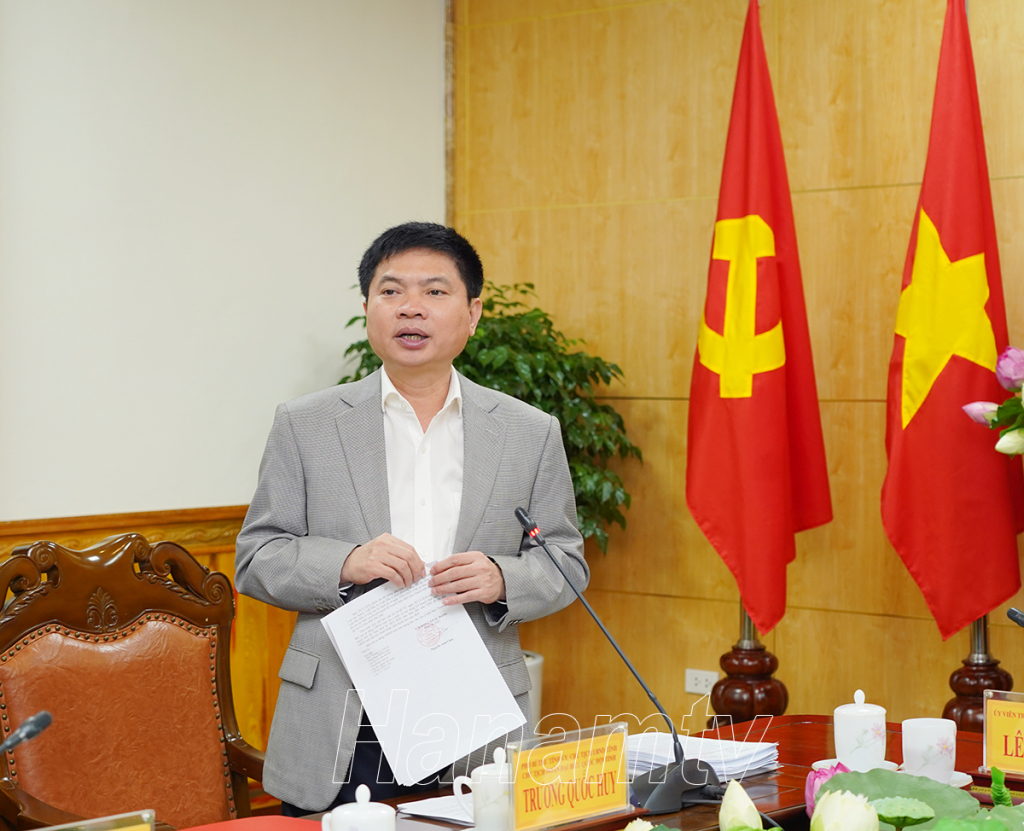 Đồng chí Trương Quốc Huy, Phó Bí thư Tỉnh ủy, Chủ tịch UBND tỉnh, Trưởng Đoàn đại biểu Quốc hội tỉnh phát biểu tại hội nghị.