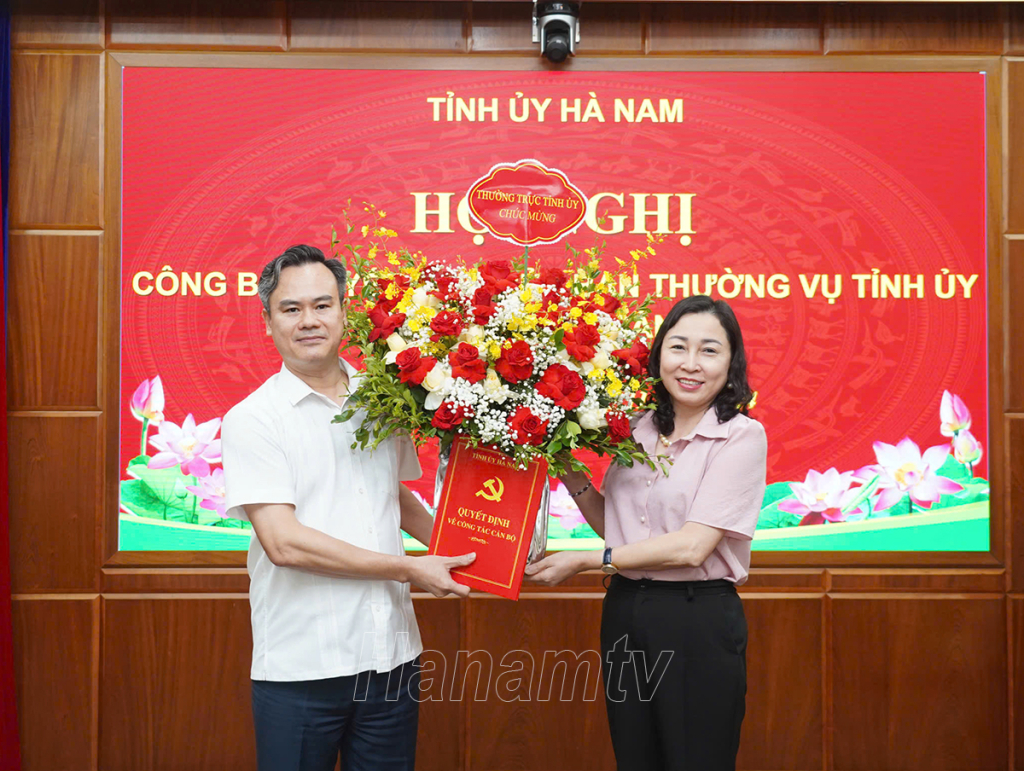 Đồng chí Phó Bí thư Thường trực Tỉnh ủy Đinh Thị Lụa trao quyết định, tặng hoa chúc mừng đồng chí Trần Nguyễn Hiền Anh