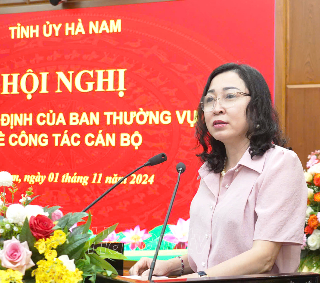 Đồng chí Đinh Thị Lụa, Phó Bí thư Thường trực Tỉnh ủy phát biểu giao nhiệm vụ cho tân Trưởng Ban Nội chính Tỉnh ủy.