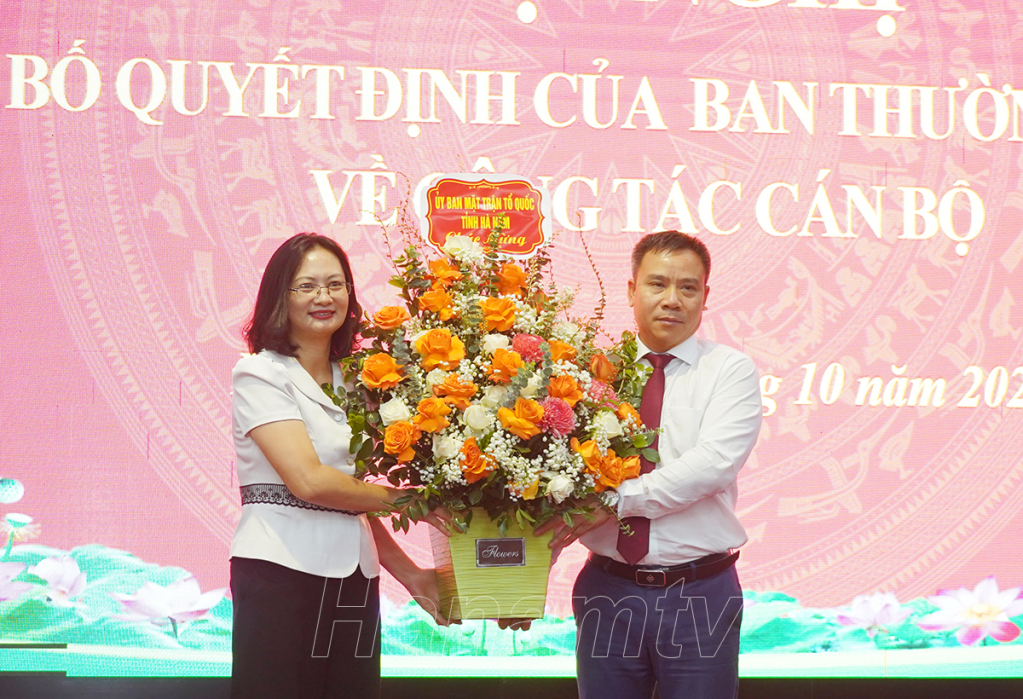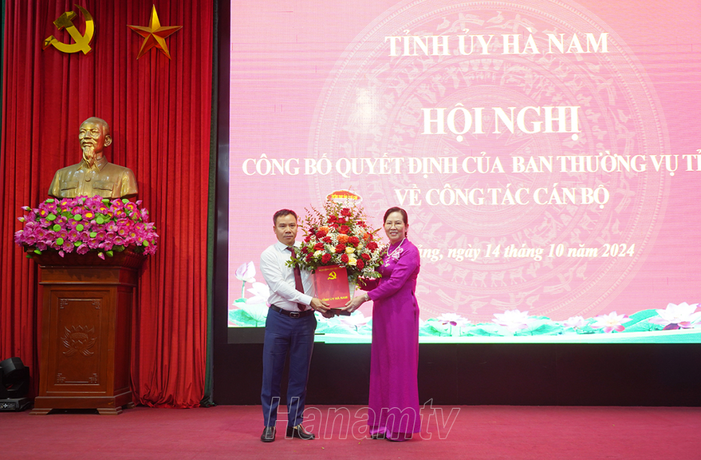 Đồng chí Lê Thị Thủy, Ủy viên Trung ương Đảng, Bí thư Tỉnh ủy, Chủ tịch HĐND tỉnh trao quyết định, tặng hoa chúc mừng đồng chí Lê Văn Hà, tân Bí thư Huyện ủy Kim Bảng.