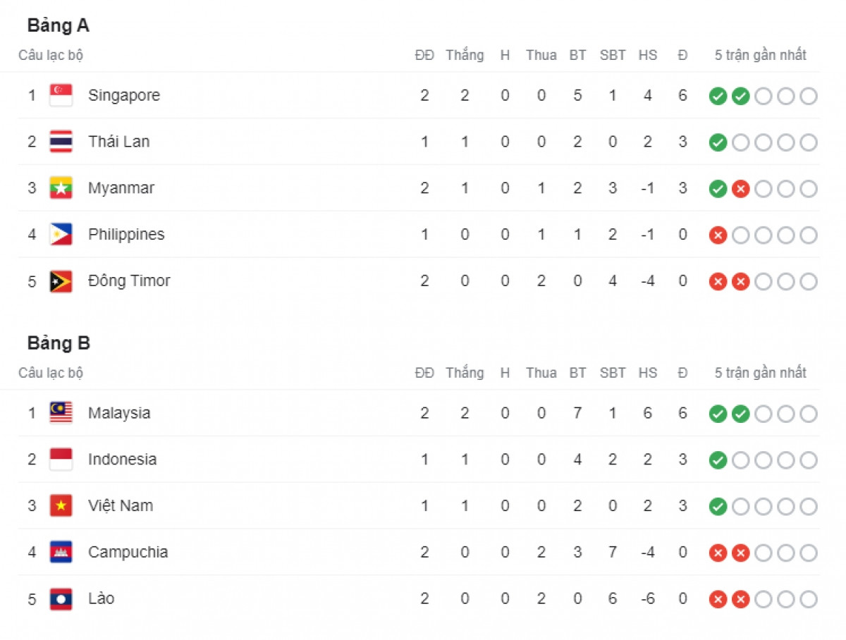 Bảng xếp hạng AFF Cup 2020 sau vòng 2: Singapore thách thức Thái Lan