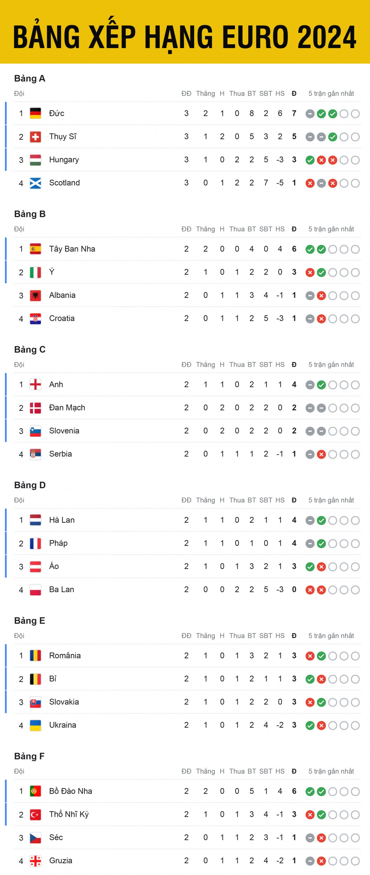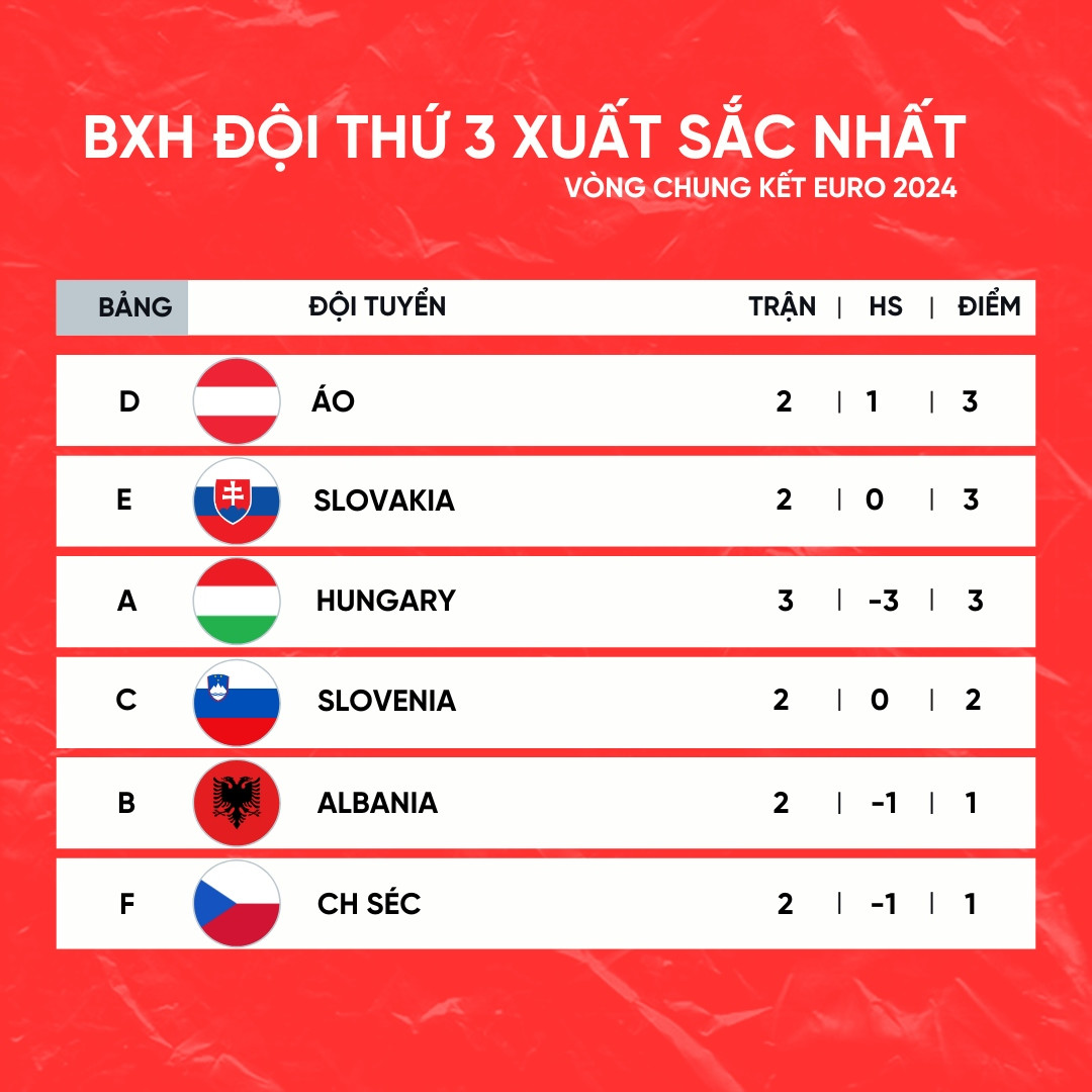 Bảng xếp hạng EURO 2024 các đội thứ 3 có thành tích tốt nhất