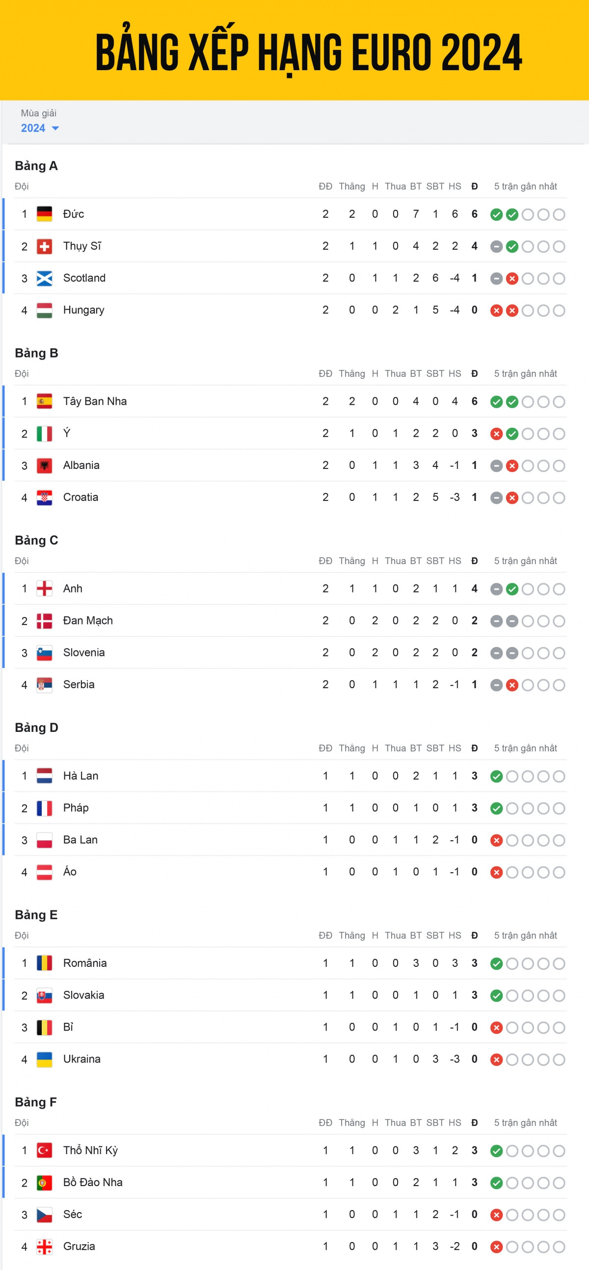Bảng xếp hạng EURO 2024 mới nhất: Xác định 2 đội giành vé sớm vào vòng 1/8