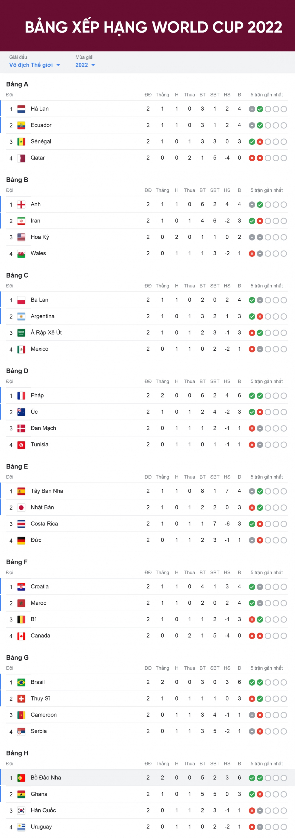 Bảng xếp hạng World Cup 2022 mới nhất: 3 đội có vé sớm, 2 đội đã bị loại