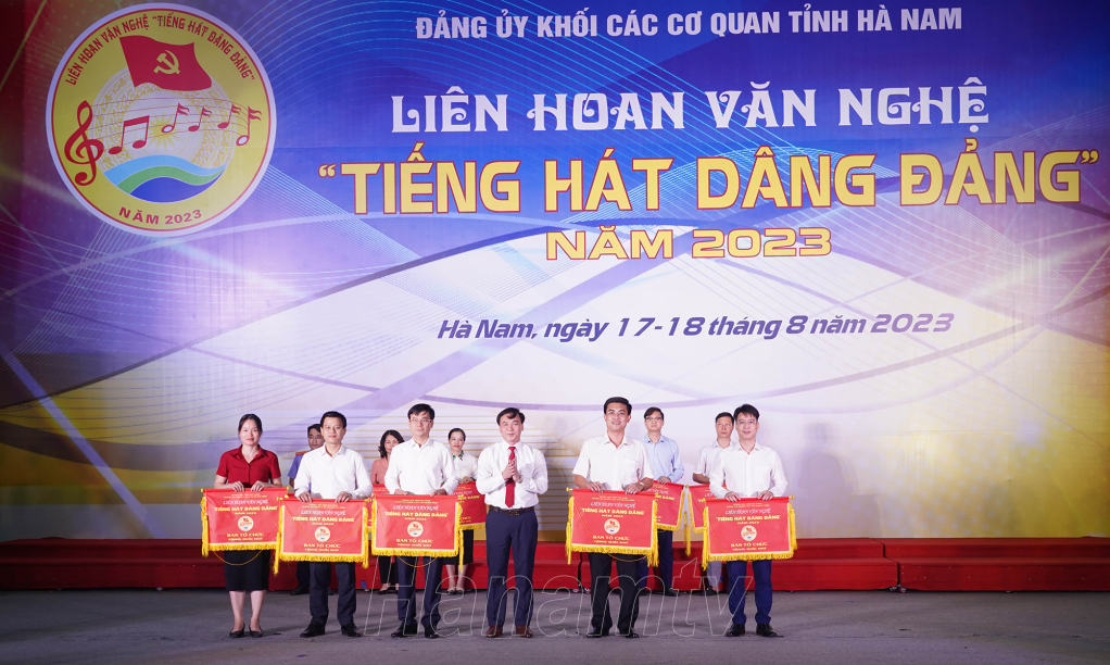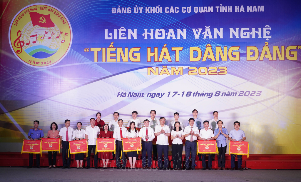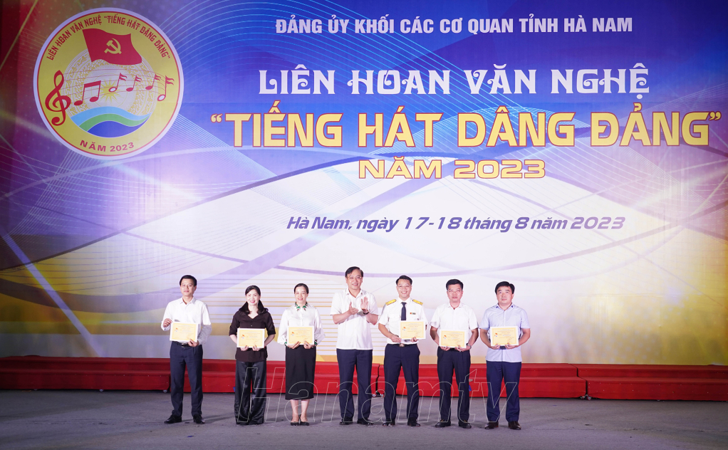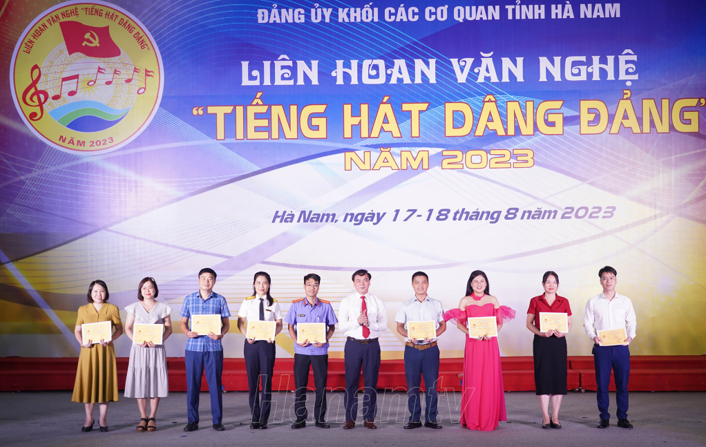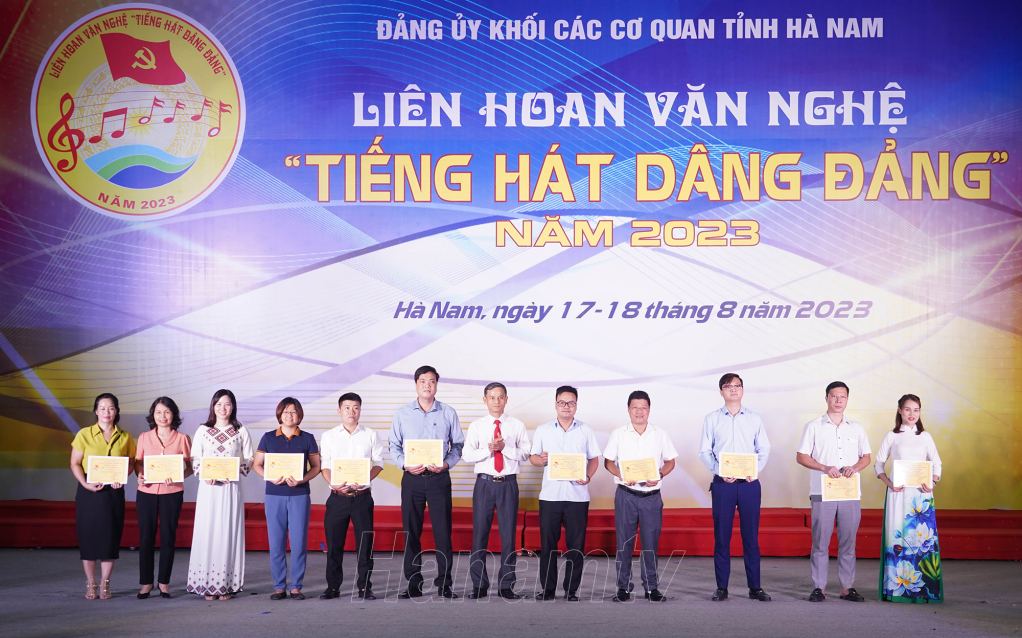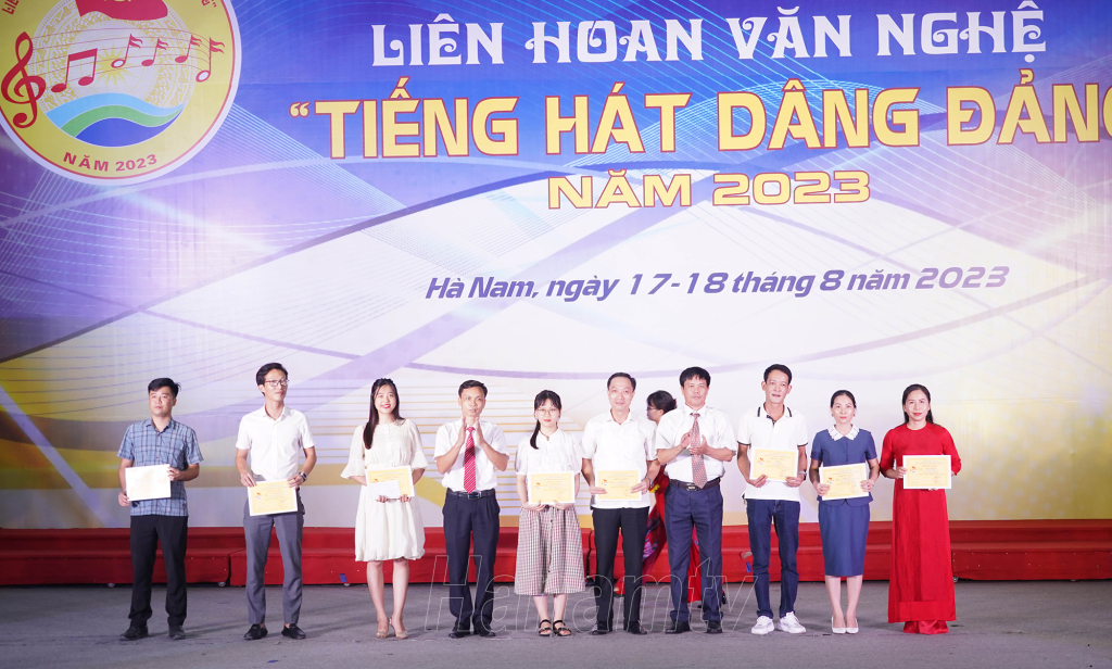 Bên cạnh đó, BTC trao 15 giải tập thể cho các đơn vị có thành tích xuất sắc tham gia Liên hoan, gồm 4 giải Nhất cho các đơn vị: Đảng bộ Sở Văn hóa, Thể thao và Du lịch; Đảng bộ cục Thuế tỉnh; Đảng bộ Kho Bạc Nhà nước tỉnh; Đảng bộ Văn phòng Tỉnh ủy; 5 giải Nhì cho các đơn vị: Đảng bộ Đài Phát thanh và Truyền hình tỉnh; Chi bộ Ban Tổ chức Tỉnh ủy; Đảng bộ Tòa án Nhân dân tỉnh; Đảng bộ Sở Nội Vụ; Đảng bộ Văn phòng Đoàn ĐBQH và HĐND tỉnh; 6 giải Ba cho Đảng bộ Viện Kiểm sát Nhân dân tỉnh; Đảng bộ Sở Nông nghiệp và Phát triển Nông thôn; Chi bộ Tỉnh đoàn Hà Nam; Đảng bộ Sở Y tế; Đảng bộ Ngân hàng Nhà nước tỉnh và Chi bộ cơ quan Ủy ban Kiểm tra Tỉnh ủy; Chi bộ cơ quan Ủy ban MTTQ tỉnh Hà Nam.