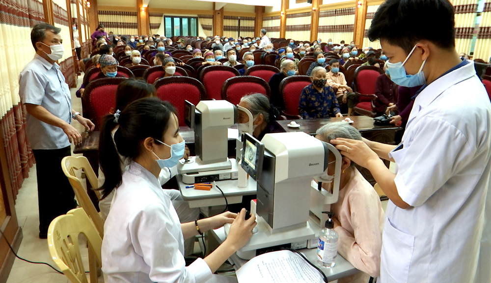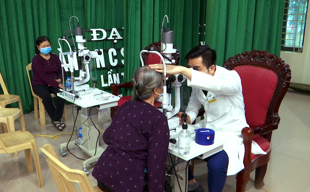 Các y, bác sỹ của bệnh viện Mắt Hà Nội - Hà Nam tham gia tư vấn, khám, cấp phát thuốc miễn phí và tặng kính cho người cao tuổi, trẻ em trên địa bàn tỉnh Hà Nam