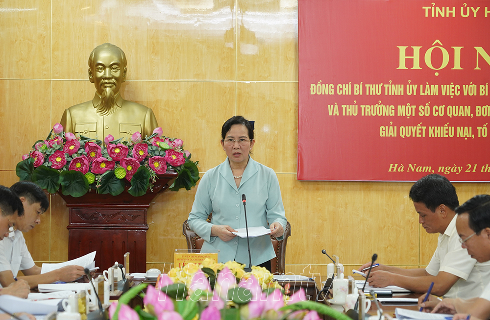 Phát biểu kết luận buổi làm việc, đồng chí Bí thư Tỉnh ủy Lê Thị Thủy nhấn mạnh cấp ủy, chính quyền, người đứng đầu các cơ quan, đơn vị, địa phương cần tập trung vào một số nhiệm vụ trọng tâm sau: Quán triệt đầy đủ, nghiêm túc, kịp thời hiệu quả chủ trương, chính sách pháp luật của Đảng, Nhà nước, các văn bản lãnh đạo, chỉ đạo của tỉnh về công tác tiếp công dân, giải quyết đơn thư KNTC và kiến nghị, phản ảnh của công dân; Tiếp tục phát huy và đề cao vai trò trách nhiệm của người đứng đầu cấp ủy, chính quyền các cơ quan, đơn vị trong tiếp công dân, giải quyết KNTC. Các đề xuất, kiến nghị, đơn thư KNTC của công dân phải được xem xét giải quyết ngay từ khi mới phát sinh tại cơ sở theo đúng quy định, đảm bảo thời gian. Thực hiện nghiêm chế độ tiếp công dân của người đứng đầu cấp ủy, chính quyền các cấp, kịp thời báo cáo cấp có thẩm quyền xem xét, chỉ đạo giải quyết các vấn đề khó khăn, vướng mắc theo đúng quy định.