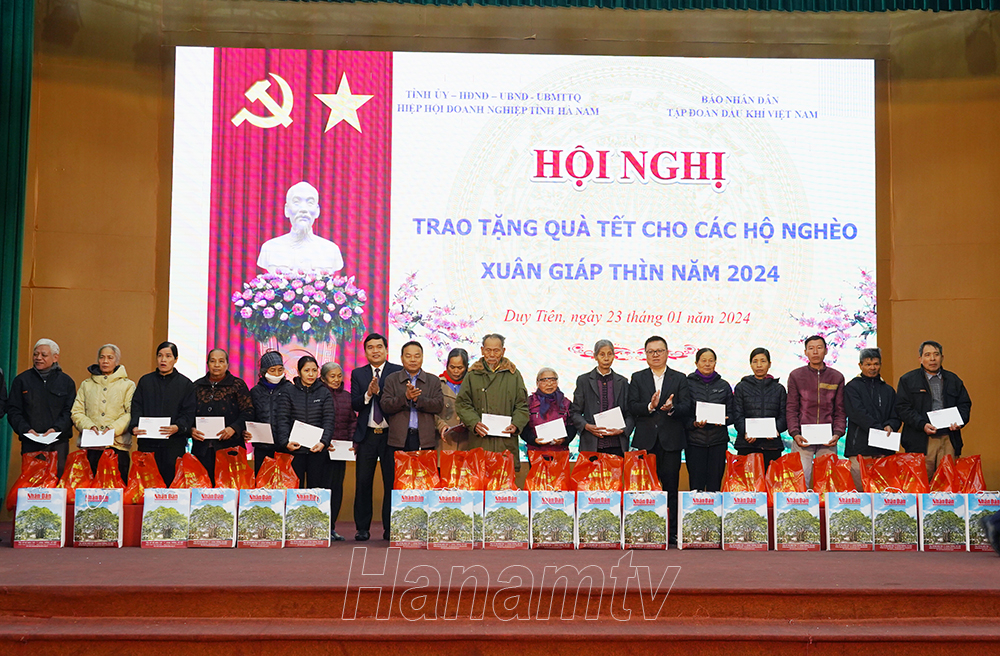 Sáng 23/1, tỉnh Hà Nam phối hợp với Báo Nhân dân, Tập đoàn Dầu khí Việt Nam, Hiệp hội Doanh nghiệp tỉnh Hà Nam tổ chức chương trình trao tặng quà Tết cho các hộ nghèo Xuân Giáp Thìn 2024 tại Thị xã Duy Tiên. Dự chương trình có đồng chí Lê Quốc Minh, Ủy viên Trung ương Đảng, Tổng Biên tập Báo Nhân dân, Phó trưởng Ban Tuyên giáo Trung ương, Chủ tịch Hội Nhà Báo Việt Nam; đồng chí Lê Thị Thủy, Ủy viên Trung ương Đảng, Bí thư Tỉnh ủy, Chủ tịch HĐND tỉnh.