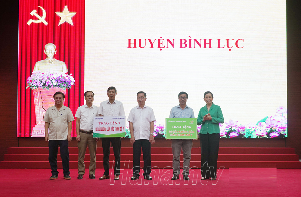 Tại hội nghị, đồng chí Bộ trưởng Bộ NN&PTNT Lê Minh Hoan và đồng chí Bí thư Tỉnh ủy Lê Thị Thủy đã trao tặng 30 tấn lúa giống Bắc Thơm số 7 cho các hộ nông dân của huyện Bình Lục bị ảnh hưởng ngập lụt trong tháng 7 vừa qua.