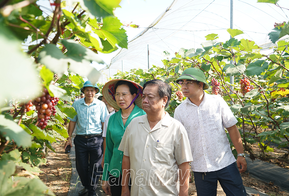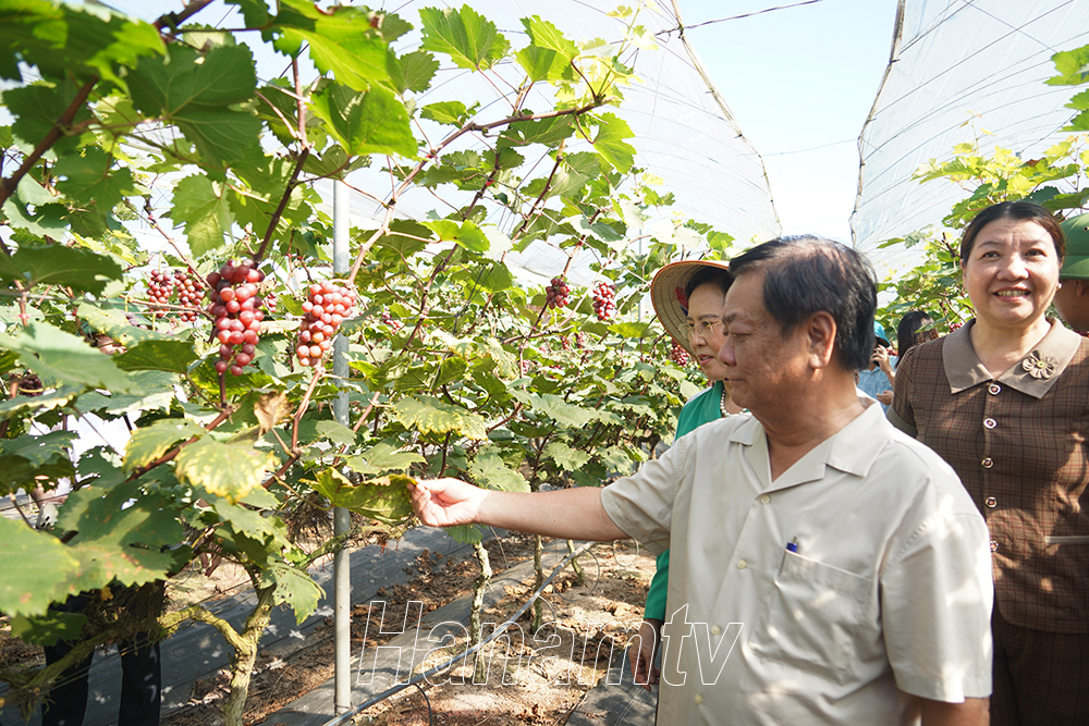 Bộ trưởng Bộ NN&PTNT Lê Minh Hoan và các đồng chí lãnh đạo tỉnh Hà Nam thăm mô hình trồng nho Hạ đen tại HTX Công nghệ cao Đồng Du (xã Đồng Du, huyện Bình Lục)