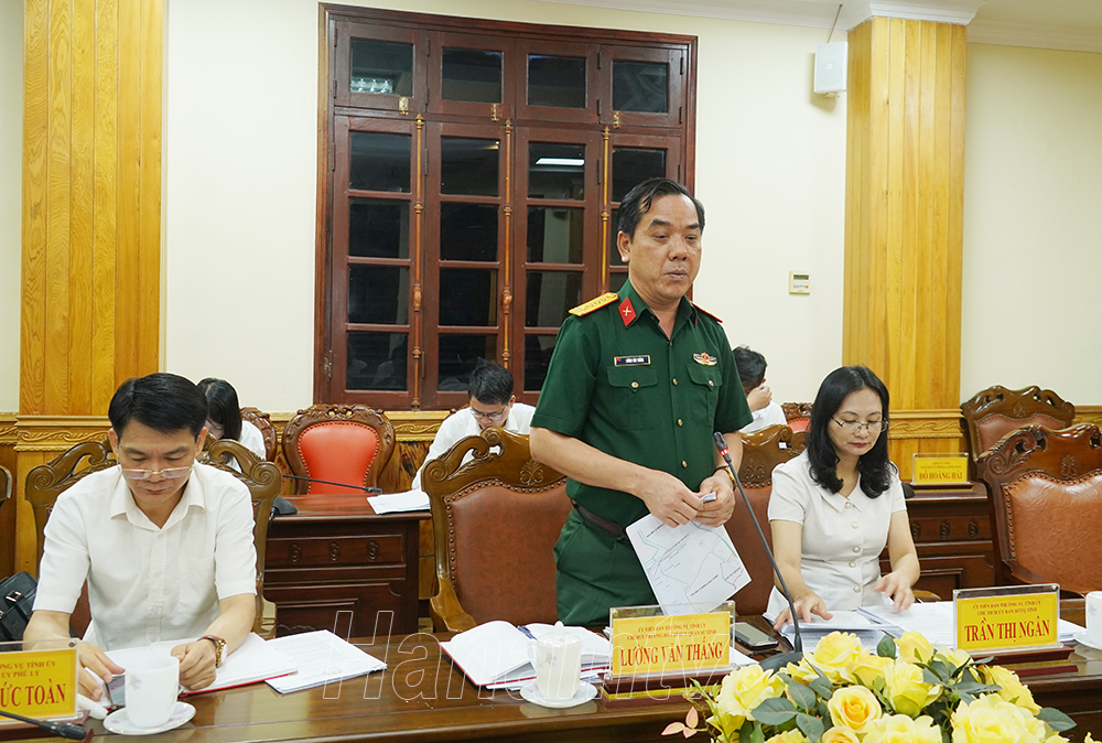 Đại tá Lường Văn Thắng, Ủy viên BTV Tỉnh ủy, Chỉ huy trưởng Bộ CHQS tỉnh phát biểu tại hội nghị.