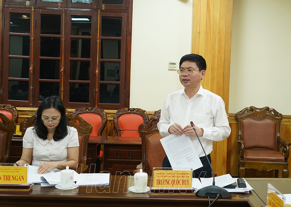 Đồng chí Trương Quốc Huy, Phó Bí thư Tỉnh ủy, Chủ tịch UBND tỉnh, Trưởng Đoàn ĐBQH tỉnh thay mặt Ban cán sự Đảng UBND tỉnh báo cáo các nội dung KT-XH xin ý kiến, chủ trương của BTV Tỉnh ủy.