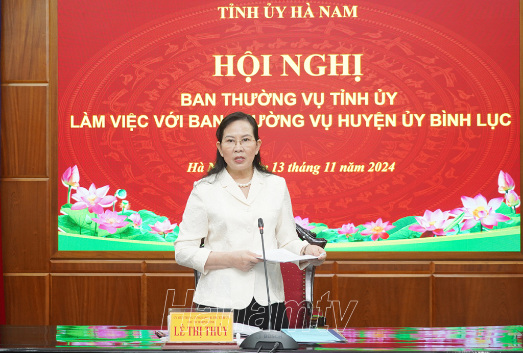 Phát biểu kết luận hội nghị, đồng chí Lê Thị Thủy, Bí thư Tỉnh ủy ghi nhận những cố gắng, nỗ lực của BTV Huyện ủy, BCH Đảng bộ huyện Bình Lục trong lãnh đạo, chỉ đạo, thực hiện các chỉ tiêu, nghị quyết đại hội Đảng bộ các cấp nhiệm kỳ 2020-2025 từ đầu nhiệm kỳ đến nay. Đồng chí đề nghị: BTV Huyện ủy tiếp tục tập trung lãnh đạo, chỉ đạo để hoàn thành các mục tiêu, chỉ tiêu Nghị quyết Đại hội Đảng bộ huyện lần thứ XXVIII đề ra. Về công tác xây dựng Đảng, xây dựng hệ thống chính trị, tiếp tục lãnh đạo, chỉ đạo quán triệt, tổ chức thực hiện hiệu quả các Nghị quyết, Chỉ thị, Kết luận,… của Trung ương và của tỉnh. Làm tốt công tác giáo dục chính trị, tư tưởng; đẩy mạnh thực hiện Nghị quyết Trung ương 4 (khóa XI, XII), Kết luận số 21 của BCH Trung ương Đảng về xây dựng, chỉnh đốn đảng và hệ thống chính trị gắn với thực hiện Chỉ thị số 05 và Kết luận số 01 của Bộ Chính trị; đề cao trách nhiệm nêu gương của cán bộ, đảng viên, nhất là người đứng đầu cấp ủy, chính quyền, cơ quan, đơn vị; triển khai thực hiện chuẩn mực đạo đức cách mạng của cán bộ, đảng viên trong giai đoạn mới theo Quy định số 144 của Bộ Chính trị.