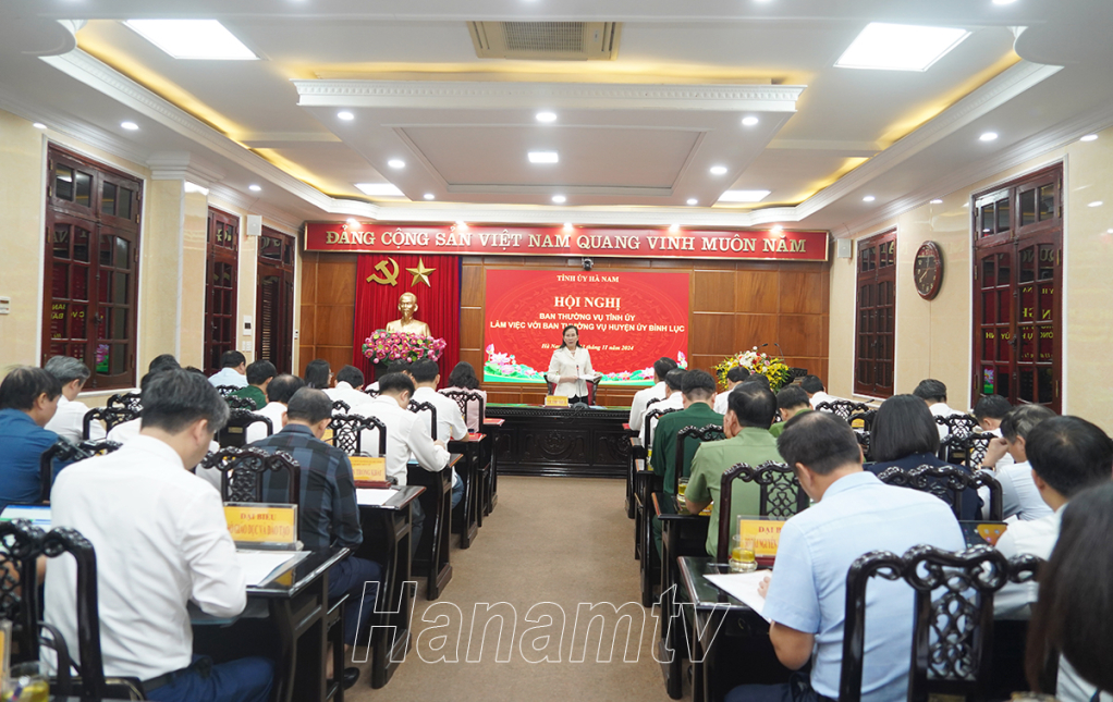 Sáng 13/11, Ban Thường vụ (BTV) Tỉnh ủy làm việc với BTV Huyện ủy Bình Lục về kết quả thực hiện Nghị quyết (NQ) Đại hội Đảng bộ huyện lần thứ XXVIII gắn với thực hiện NQ Đại hội Đảng bộ tỉnh lần thứ XX, nhiệm kỳ 2020 – 2025. Đồng chí Lê Thị Thủy, Ủy viên Trung ương Đảng, Bí thư Tỉnh ủy, Chủ tịch HĐND tỉnh chủ trì hội nghị.