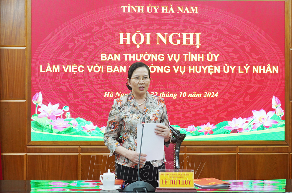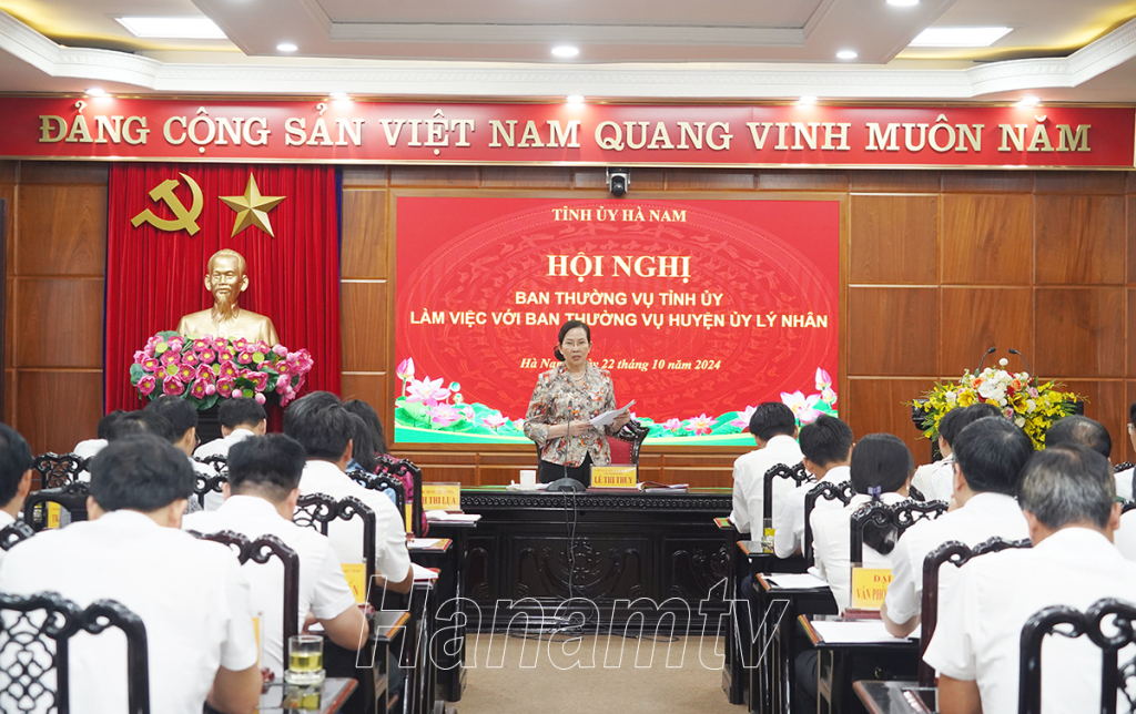 Chiều 22/10, Ban Thường vụ (BTV) Tỉnh ủy làm việc với BTV Huyện ủy Lý Nhân về kết quả thực hiện Nghị quyết (NQ) Đại hội Đảng bộ tỉnh lần thứ XX, Nghị quyết Đại hội Đảng bộ huyện lần thứ XXVI, nhiệm kỳ 2020 – 2025. Đồng chí Lê Thị Thủy, Ủy viên Trung ương Đảng, Bí thư Tỉnh ủy, Chủ tịch HĐND tỉnh chủ trì hội nghị.