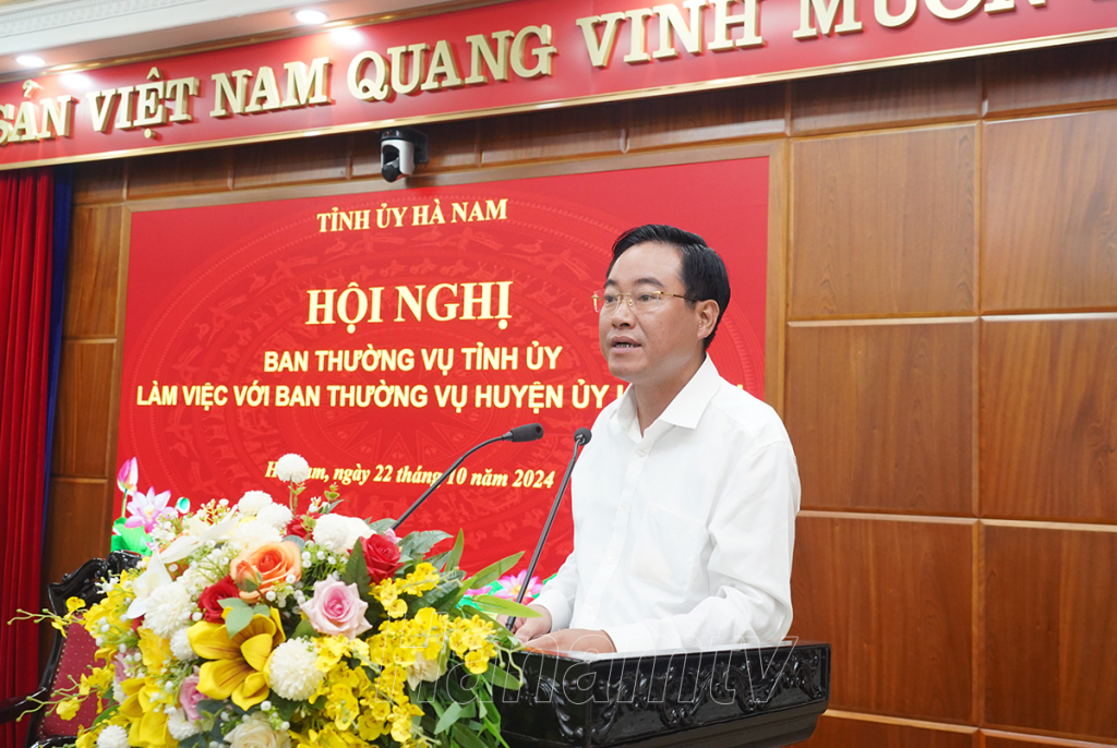 Phát biểu kết luận hội nghị, đồng chí Bí thư Tỉnh ủy Lê Thị Thủy đề nghị BTV Huyện ủy Lý Nhân tiếp tục tập trung lãnh đạo, chỉ đạo để hoàn thành các mục tiêu, chỉ tiêu mà NQ Đại hội Đảng bộ huyện lần thứ XXVI đã đề ra; góp phần thực hiện thắng lợi NQ Đại hội Đảng bộ tỉnh lần thứ XX; đồng thời, chỉ đạo chuẩn bị tốt Đại hội Đảng bộ huyện lần thứ 27 và Đại hội đảng bộ các cấp cơ sở. Trong đó đồng chí nhấn mạnh một số nhiệm vụ trọng tâm. Đó là: Tiếp tục lãnh đạo, chỉ đạo thực hiện có hiệu quả các Nghị quyết của Trung ương, các Nghị quyết, Chương trình, Đề án của Tỉnh ủy, BTV Tỉnh ủy; Làm tốt công tác giáo dục chính trị, tư tưởng; đẩy mạnh thực hiện Nghị quyết Trung ương 4 (khóa XII), Kết luận số 21-KL/TW ngày 25/10/2021 của Ban Chấp hành Trung ương về xây dựng, chỉnh đốn đảng và hệ thống chính trị gắn với thực hiện Chỉ thị số 05-CT/TW và Kết luận số 01-KL/TW ngày 18/5/2021 của Bộ Chính trị về học tập và làm theo tư tưởng, đạo đức, phong cách Hồ Chí Minh; tích cực đấu tranh phản bác các quan điểm sai trái, thù địch, bảo vệ nền tảng tư tưởng của Đảng…Tiếp tục thực hiện tốt công tác đào tạo, bồi dưỡng, điều động, luân chuyển cán bộ để chuẩn bị nhân sự Đại hội Đảng bộ các cấp nhiệm kỳ 2025-2030 và bầu cử đại biểu HĐND các cấp nhiệm kỳ 2026 - 2031.