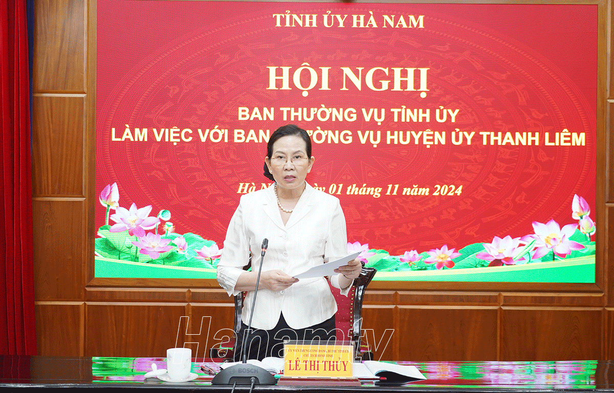 Phát biểu kết luận, đồng chí Lê Thị Thủy, Ủy viên Trung ương Đảng, Bí thư Tỉnh ủy, Chủ tịch HĐND tỉnh nhấn mạnh: BTV Tỉnh ủy cơ bản thống nhất với phương hướng, mục tiêu, nhiệm vụ, giải pháp đã nêu trong Báo cáo; đồng thời đề nghị BTV Huyện ủy Thanh Liêm cần tiếp tục nhận định rõ tình hình trong năm 2025 có nhiều thay đổi, biến động, để từ đó chủ động, tích cực, linh hoạt trong lãnh đạo, chỉ đạo, tận dụng và phát huy tối đa các lợi thế, cơ hội để phát triển; chủ động ứng phó kịp thời trước các tình huống, diễn biến mới; khắc phục những tồn tại, hạn chế đã được chỉ ra; phát huy những kết quả đã đạt được và thực hiện các giải pháp quyết liệt để hoàn thành các mục tiêu, chỉ tiêu mà Nghị quyết Đại hội Đảng bộ huyện lần thứ 30 đã đề ra; góp phần thực hiện thắng lợi Nghị quyết Đại hội Đảng bộ tỉnh lần thứ XX, Nghị quyết Đại hội lần thứ XIII của Đảng.