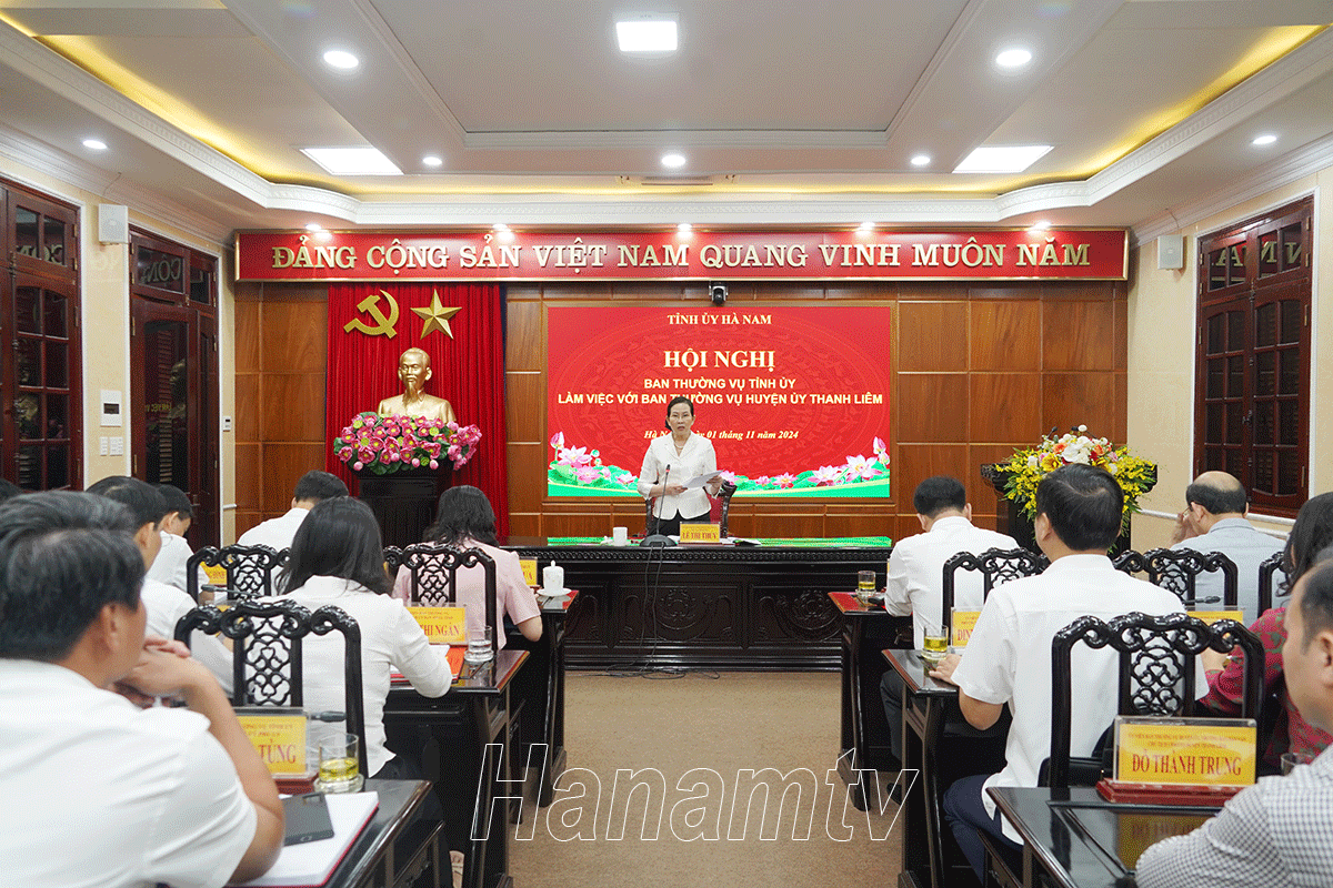 Sáng 1/11, Ban Thường vụ (BTV) Tỉnh ủy làm việc với BTV Huyện ủy Thanh Liêm về kết quả thực hiện Nghị quyết (NQ) Đại hội Đảng bộ tỉnh lần thứ XX, Nghị quyết Đại hội Đảng bộ huyện lần thứ XXX, nhiệm kỳ 2020 – 2025. Đồng chí Lê Thị Thủy, Ủy viên Trung ương Đảng, Bí thư Tỉnh ủy, Chủ tịch HĐND tỉnh chủ trì hội nghị.