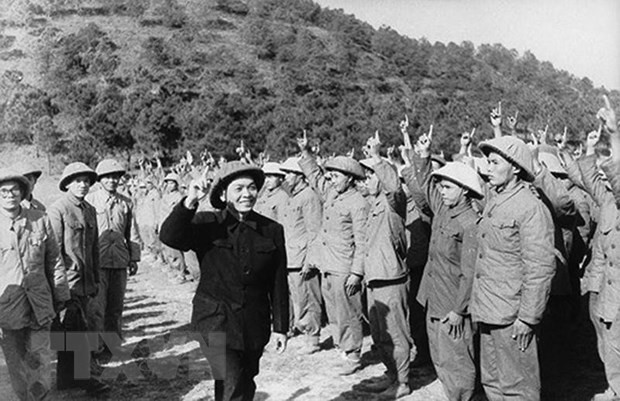 Đại tướng Tổng Tư lệnh Võ Nguyên Giáp chung vui cùng các chiến sĩ trong lễ mừng chiến thắng, tổ chức tại Sở chỉ huy ở Mường Phăng trong chiến dịch Điện Biên Phủ “lừng lẫy năm châu, chấn động địa cầu”. (Ảnh: TTXVN)