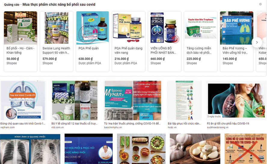Không khó để tìm mua các loại thực phẩm chức năng được quảng cáo như thuốc chữa bệnh, chỉ cần search “thuốc bổ phổi” trên Google và các ứng dụng mạng xã hội, người dùng có thể tìm được hàng chục loại thực phẩm chức năng có công dụng kể trên với nguồn gốc “xách tay” từ Nhật Bản, Hàn Quốc, Đức... Người bán hàng tự tin quảng cáo đây là thuốc “xịn” được các nước tiên tiến về y học tin dùng vì có tác dụng bổ phổi, chữa được bệnh hậu Covid-19... Không ít người chia sẻ rằng mình có triệu chứng “hậu Covid-19” nhưng nay đã ổn định sức khỏe “tức thì” nhờ uống một lúc lúc đến... 4 loại thực phẩm chức năng.