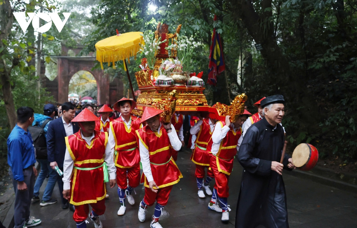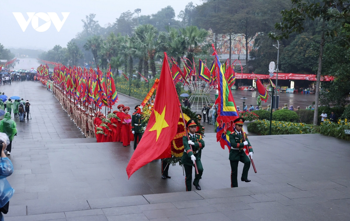 Trong không khí trang nghiêm cùng với tiếng nhạc hội hùng tráng, đoàn dâng hương với đội nghi trượng uy nghiêm, đoàn cờ phướn lộng lẫy khởi hành từ sân Trung tâm lễ hội qua Nghi môn, đền Hạ, đền Trung lên đền Thượng. Đi đầu đoàn hành lễ là các chiến sĩ Quân đội nhân dân Việt Nam rước Quốc kỳ, cờ hội và vòng hoa mang dòng chữ "Đời đời nhớ ơn các Vua Hùng đã có công dựng nước".