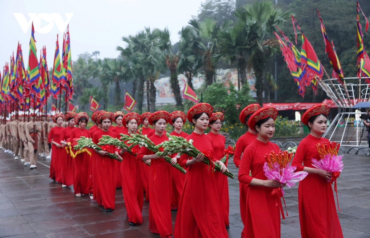 Theo sau là các thiếu nữ mặc áo dài đỏ mang hương, hoa, lễ vật và 100 con Lạc, cháu Hồng trong trang phục cổ, tay giương cao cờ hội, thể hiện sức sống mãnh liệt của dòng giống Tiên Rồng, cùng đoàn rước kiệu dâng lễ vật hương, hoa, bánh chưng, bánh dày gắn liền với truyền thuyết về vị hoàng tử Lang Liêu và quan niệm Trời tròn - Đất vuông của cha ông ta. Tiếp đó là đoàn đại biểu lãnh đạo Ðảng, Nhà nước, các cơ quan Trung ương, các địa phương; lãnh đạo tỉnh Phú Thọ, các sở, ngành, đoàn thể, huyện, thành, thị và nhân dân về dự Lễ dâng hương.