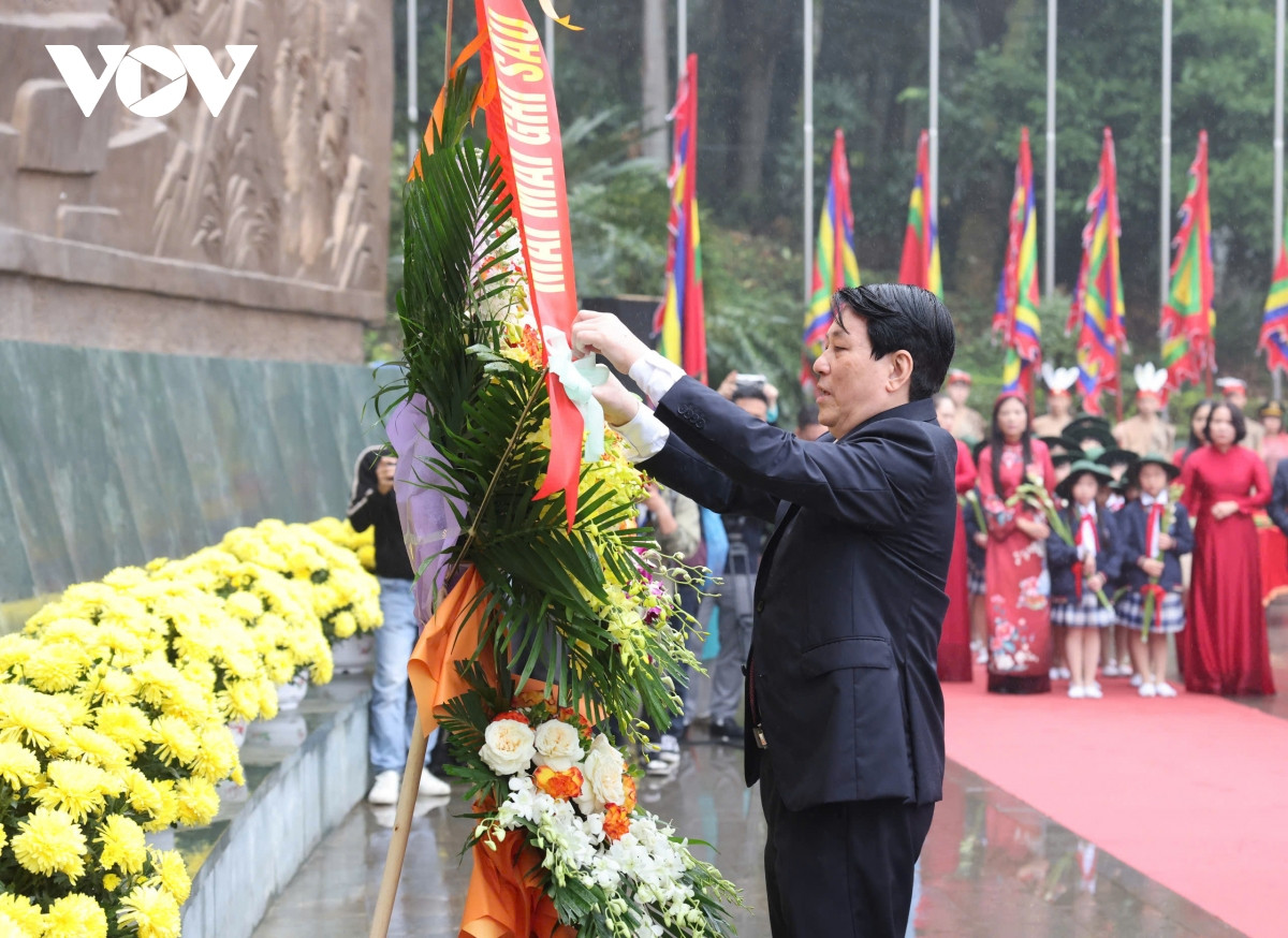 Trong giờ phút lắng đọng hồn thiêng sông núi, Chủ tịch nước Lương Cường cùng các đồng chí lãnh đạo Đảng, Nhà nước cùng các đại biểu đặt vòng hoa, thắp hương tại Lăng Hùng Vương; thành kính tưởng niệm Chủ tịch Hồ Chí Minh và các chiến sĩ đã hy sinh vì Tổ quốc bên Bức phù điêu có hình tượng Bác Hồ nói chuyện với cán bộ, chiến sĩ Đại đoàn quân Tiên Phong tại ngã năm Đền Giếng.