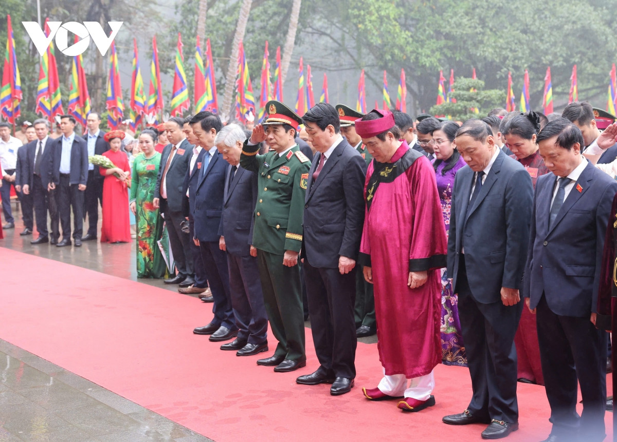 Trong giờ phút lắng đọng hồn thiêng sông núi, Chủ tịch nước Lương Cường cùng các đồng chí lãnh đạo Đảng, Nhà nước cùng các đại biểu đặt vòng hoa, thắp hương tại Lăng Hùng Vương; thành kính tưởng niệm Chủ tịch Hồ Chí Minh và các chiến sĩ đã hy sinh vì Tổ quốc.
