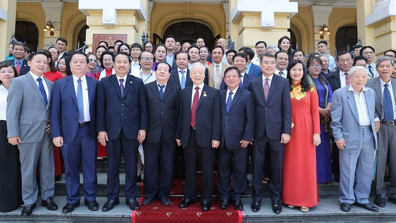 Tổng Bí thư Nguyễn Phú Trọng với các đại biểu dự Lễ kỷ niệm 75 năm Ngày thành lập Liên hiệp các Hội Văn học nghệ thuật Việt Nam (1948 - 2023) sáng 25/7/2023