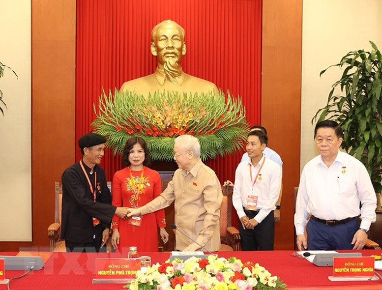 Tổng Bí thư Nguyễn Phú Trọng và Trưởng ban Tuyên giáo Trung ương Nguyễn Trọng Nghĩa gặp mặt Đoàn đại biểu điển hình tiêu biểu toàn quốc học tập và làm theo tư tưởng, đạo đức, phong cách Hồ Chí Minh năm 2023, sáng 2/11/2023
