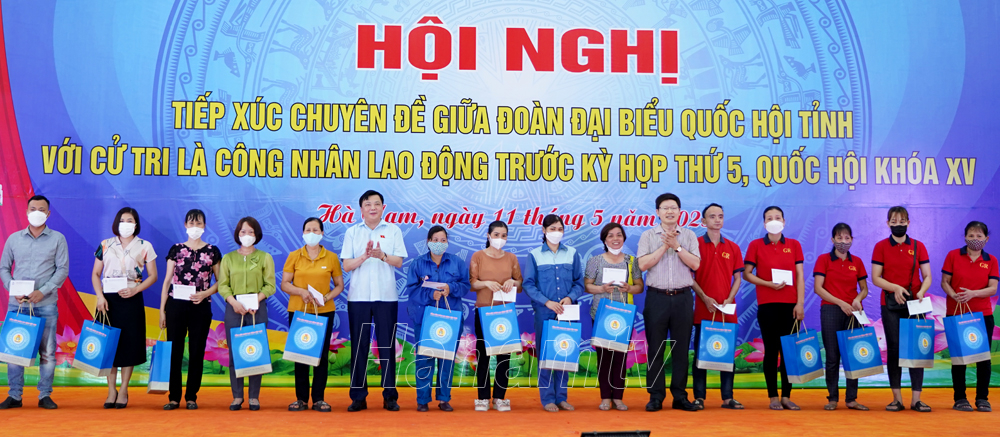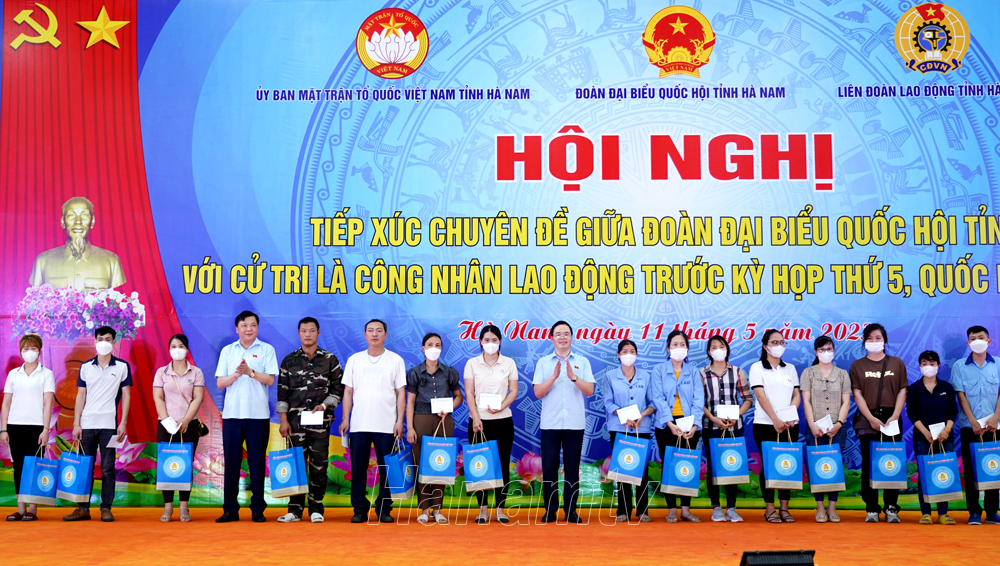 Các vị ĐBQH tỉnh Hà Nam và đại diện lãnh đạo Tổng LĐLĐ Việt Nam trao quà cho công nhân lao động có hoàn cảnh khó khăn