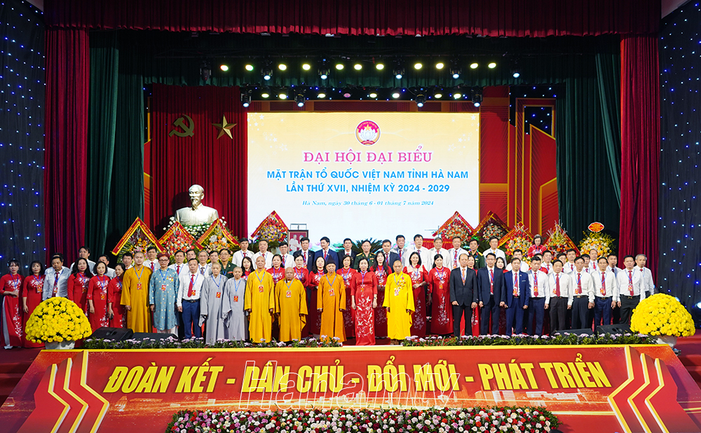 Các đồng chí lãnh đạo Ủy ban Trung ương MTTQ Việt Nam, lãnh đạo tỉnh Hà Nam chụp ảnh lưu niệm với Ủy ban MTTQ Việt Nam tỉnh Hà Nam khóa XVII, nhiệm kỳ 2024 - 2029.