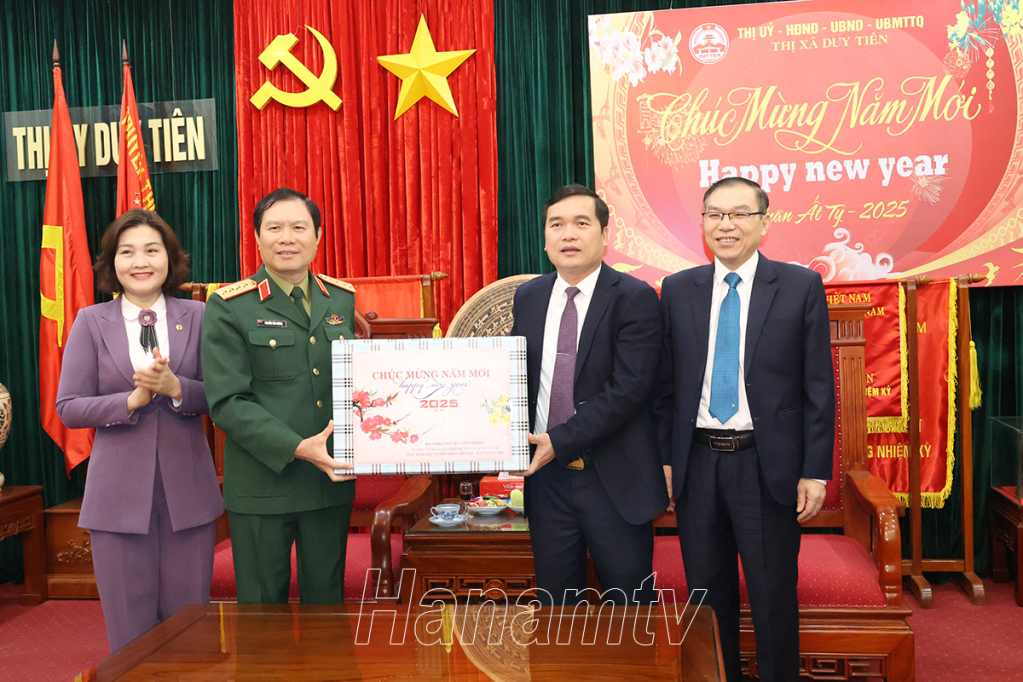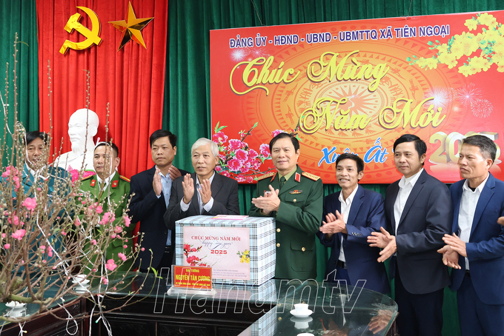 Cũng trong sáng nay, Đại tướng Nguyễn Tân Cương và đoàn công tác đã đến thăm, tặng quà, chúc Tết Thị ủy, UBND, Ban CHQS thị xã Duy Tiên và Đảng bộ, chính quyền, nhân dân xã Tiên Ngoại (thị xã Duy Tiên) và các thương bệnh binh tại Trung tâm điều dưỡng thương binh Duy Tiên.