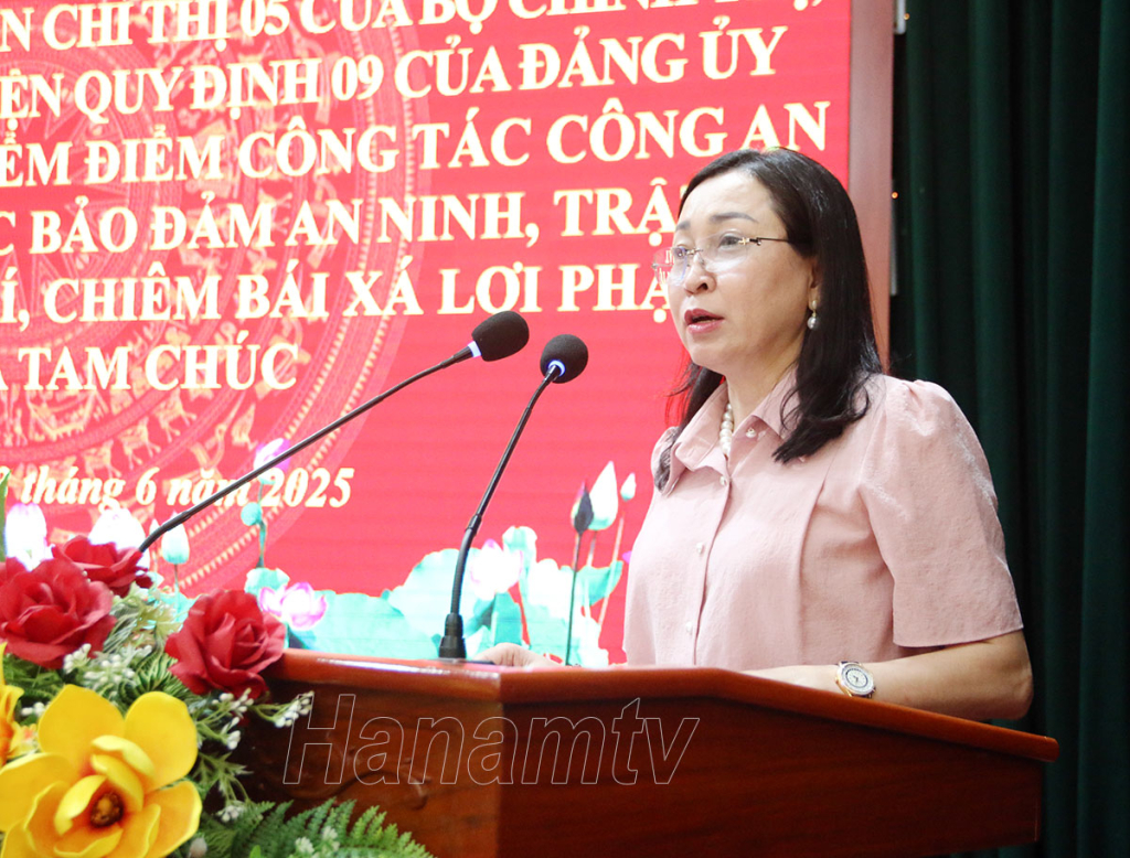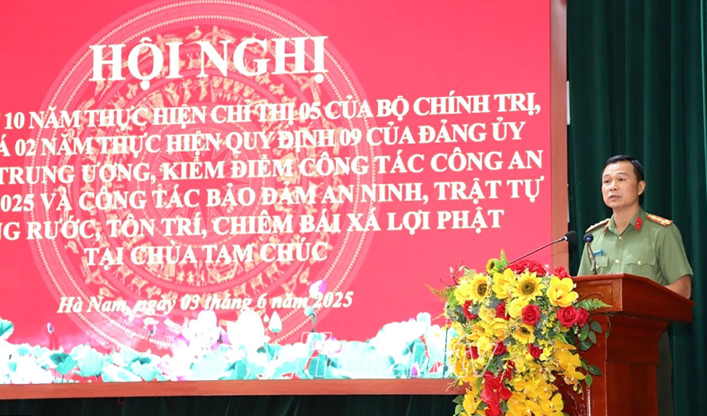 Chiều 3/6, Đảng ủy Công an tỉnh tổ chức hội nghị tổng kết 10 năm thực hiện Chỉ thị 05 - CT/TW của Bộ Chính trị về đẩy mạnh học tập và làm theo tư tưởng, đạo đức, phong cách Hồ Chí Minh; đánh giá 2 năm thực hiện Quy định 09 của Đảng ủy Công an Trung ương về chế độ học tập, thực hiện Sáu điều Bác Hồ dạy Công an nhân dân (CAND) và đánh giá công tác lãnh đạo, chỉ đạo thực hiện nhiệm vụ bảo đảm an ninh trật tự (ANTT) Lễ cung rước, tôn trí, chiêm bái xá lợi Đức Phật và Đại lễ Phật đản tại chùa Tam Chúc. Dự hội nghị có các đồng chí: Đinh Thị Lụa, Phó Bí thư Thường trực Tỉnh ủy; Nguyễn Anh Chức, Ủy viên Ban Thường vụ (BTV) Tỉnh ủy, Phó Chủ tịch Thường trực UBND tỉnh; Đại tá Tô Anh Dũng, Ủy viên BTV Tỉnh ủy, Bí thư Đảng ủy, Giám đốc Công an tỉnh.