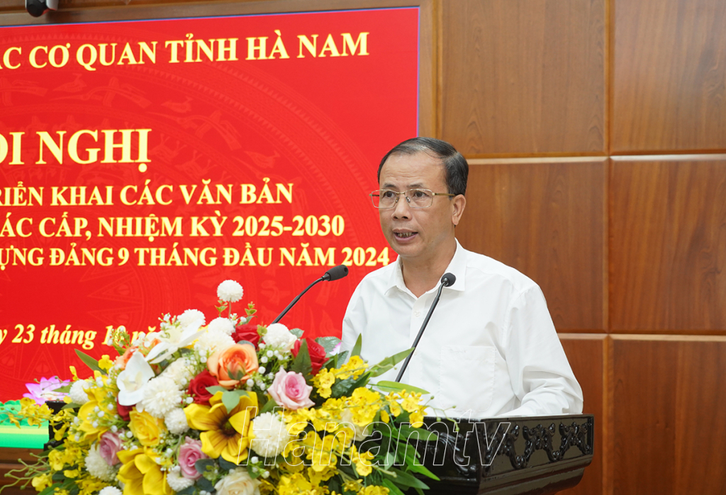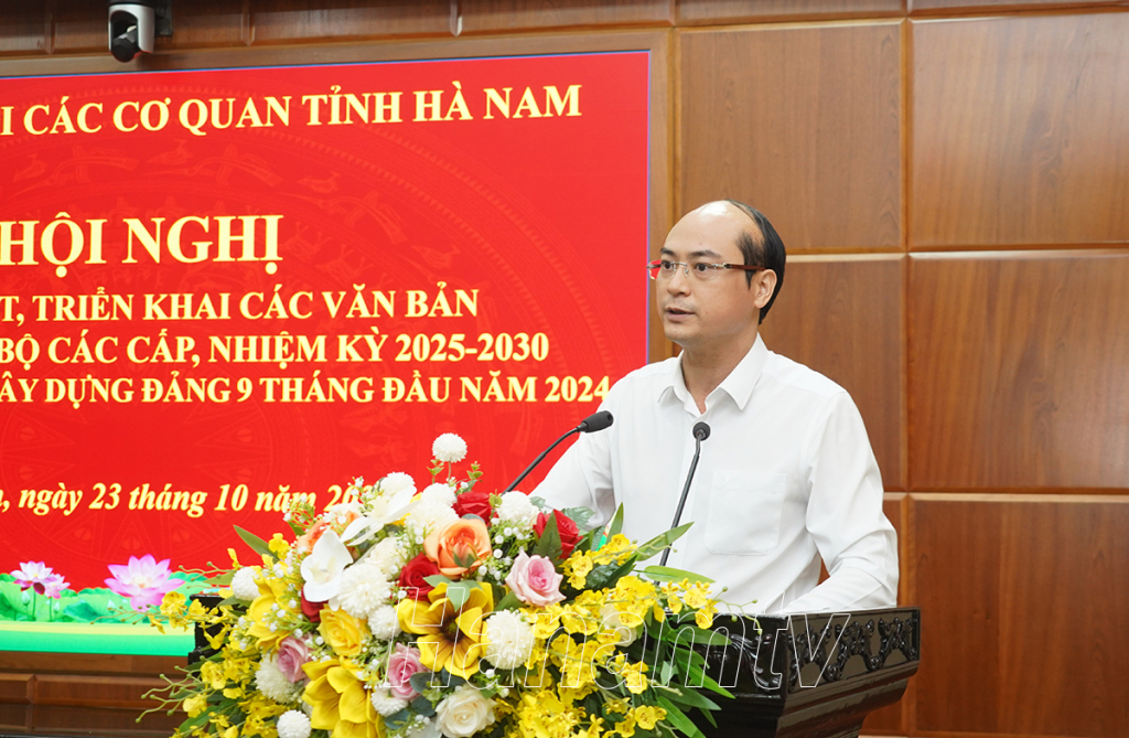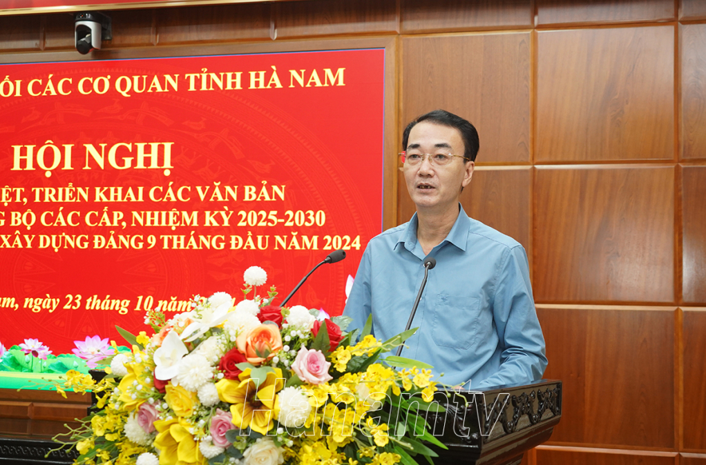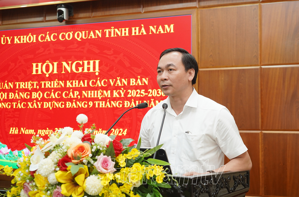 Tại hội nghị, đồng chí Bí thư Đảng ủy Khối CCQ tỉnh đã quán triệt, triển khai các văn bản của Trung ương, của tỉnh về một số nội dung Chỉ thị 35-CT/TW ngày 14/6/2024 của Bộ Chính trị về Đại hội đảng bộ các cấp tiến tới Đại hội đại biểu toàn quốc lần thứ XIV của Đảng, gồm: Hướng dẫn số 27-HD/BTCTW, ngày 26/8/2024 của Ban Tổ chức Trung ương; Hướng dẫn số 16-HD/TU, ngày 23/9/2024 của Ban Thường vụ Tỉnh ủy Hà Nam; Hướng dẫn số 45-HD/ĐUK, ngày 01/10/2024 của Ban Thường vụ Đảng ủy Khối các cơ quan tỉnh Hà Nam.