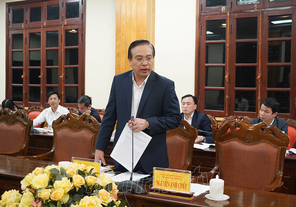Sáng 24/2, đồng chí Lê Thị Thủy, Ủy viên TW Đảng, Bí thư Tỉnh ủy, Chủ tịch HĐND tỉnh chủ trì hội nghị Ban chỉ đạo (BCĐ) chỉ đạo, đôn đốc, kiểm tra việc thực hiện các thông báo, kết luận của Tỉnh ủy, Ban Thường vụ (BTV) Tỉnh ủy, Thường trực Tỉnh ủy đối với các dự án đầu tư, dự án trọng điểm trên địa bàn tỉnh. Dự hội nghị có các đồng chí: Trương Quốc Huy, Phó Bí thư Tỉnh ủy, Chủ tịch UBND tỉnh, Trưởng đoàn ĐBQH tỉnh; các đồng chí Ủy viên BTV Tỉnh ủy là thành viên BCĐ.