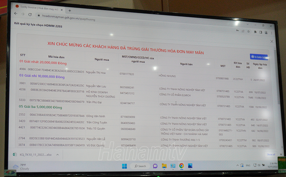 Danh sách người tiêu dùng sử dụng hóa đơn khi mua hàng đã trúng thưởng "Hóa đơn may mắn" được quay thưởng vào ngày 10/11/2022