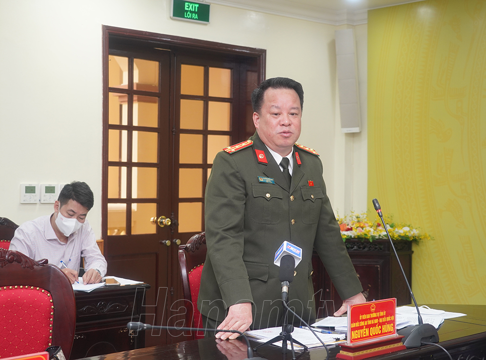 Đại tá Nguyễn Quốc Hùng, Ủy viên BTV Tỉnh ủy, Giám đốc Công an tỉnh, ĐBQH tỉnh Hà Nam khóa XV đóng góp ý kiến tại phiên thảo luận tổ.