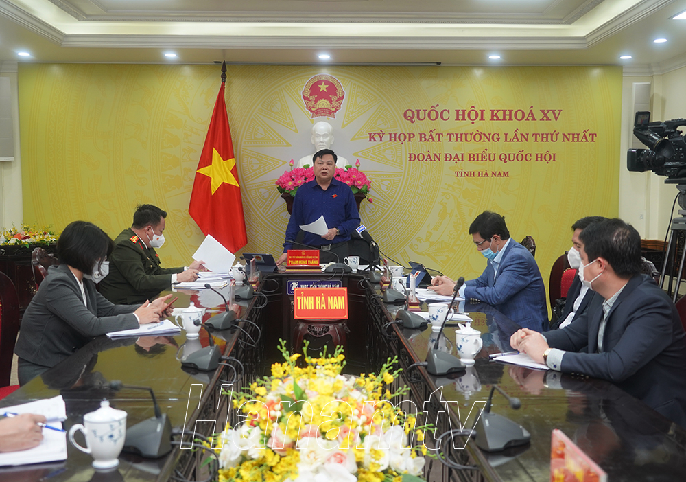 Tiếp tục chương trình Kỳ họp bất thường lần thứ nhất, Quốc hội khóa XV, chiều 04/01, Đoàn đại biểu Quốc hội (ĐBQH) các tỉnh, thành phố đã tiến hành thảo luận tổ về dự thảo Nghị quyết của Quốc hội về chính sách tài khóa, tiền tệ để hỗ trợ triển khai Chương trình phục hồi và phát triển kinh tế - xã hội. Đồng chí Phạm Hùng Thắng, Phó Trưởng Đoàn ĐBQH chuyên trách chủ trì phiên thảo luận tổ của Đoàn ĐBQH tỉnh Hà Nam.