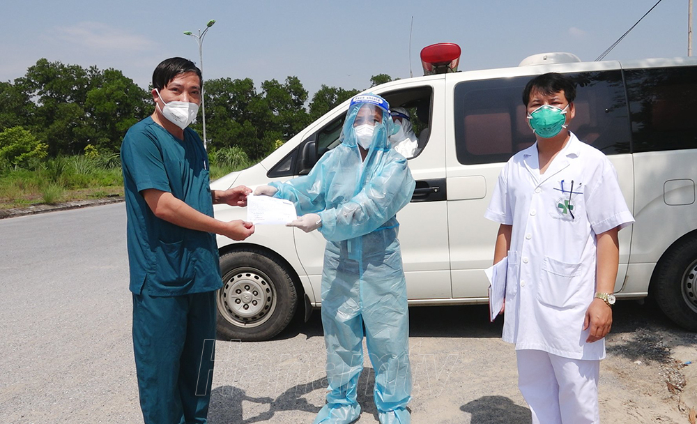 Bác sỹ Trần Đình Lợi, Phó Giám đốc Bệnh viện Đa khoa tỉnh Hà Nam, Giám đốc Bệnh viện Dã chiến số 1 Hà Nam trao giấy xuất viện cho những bệnh nhân đầu tiên khỏi bệnh, ra viện