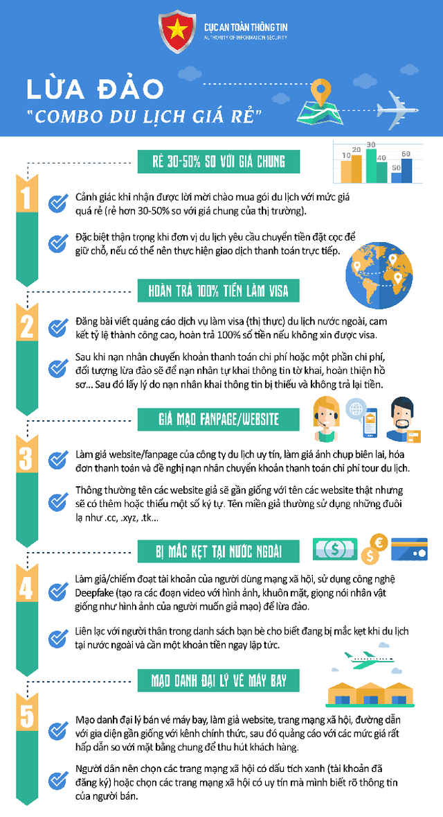 - Đề nghị nạn nhân chuyển tiền (từ 30-50% giá trị vé) để đặt cọc tour du lịch, phòng khách sạn.