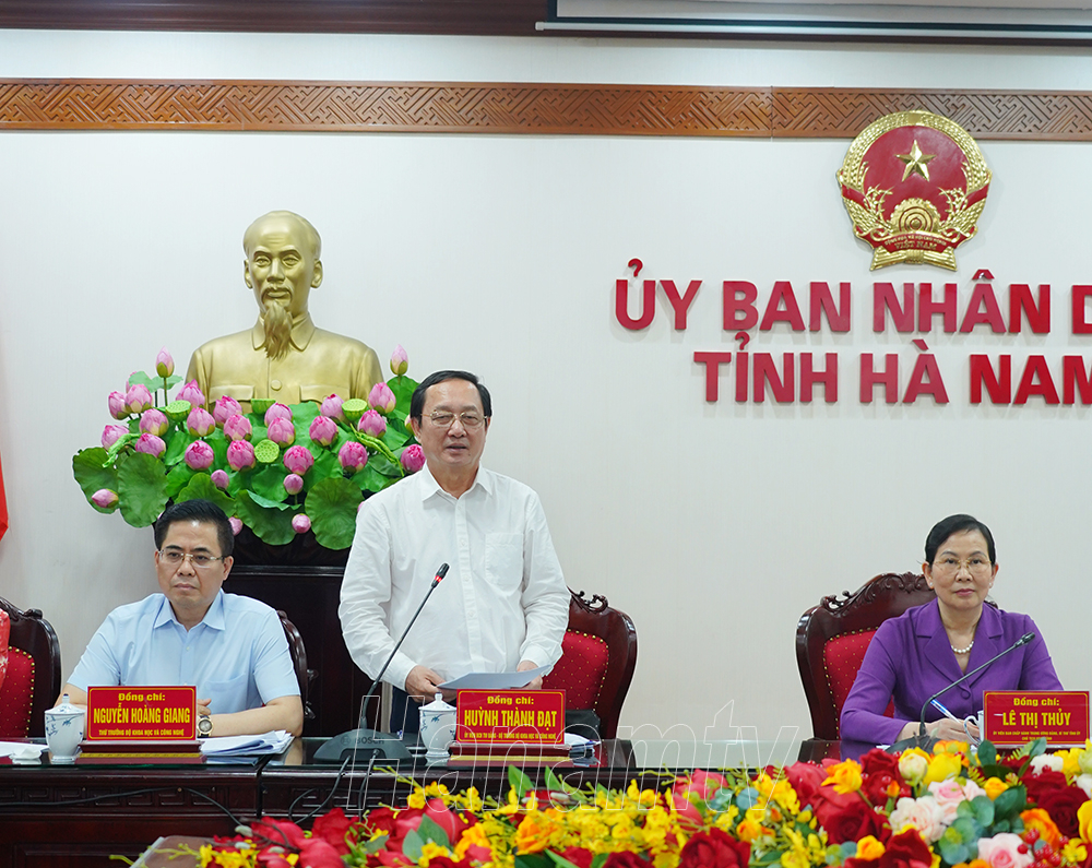 Phát biểu tại buổi làm việc, đồng chí Huỳnh Thành Đạt, Ủy viên Trung ương Đảng, Bộ trưởng Bộ KH&CN ghi nhận, đánh giá cao sự quan tâm đầu tư của tỉnh Hà Nam đối với lĩnh vực KH&CN. Trên cơ sở những tồn tại, hạn chế của hoạt động KH&CN trên địa bàn tỉnh đã được chỉ ra tại hội nghị, Bộ trưởng Huỳnh Thành Đạt đề nghị tỉnh Hà Nam tiếp tục quan tâm, lãnh đạo, chỉ đạo sâu sát hơn nữa đối với hoạt động khoa học, công nghệ và đổi mới sáng tạo trên địa bàn tỉnh. Quan tâm lãnh đạo, chỉ đạo hoàn thiện cơ chế, chính sách và tăng cường đầu tư cho hoạt động Khoa học, Công nghệ và Đổi mới sáng tạo trong thời gian tới, tập trung bố trí nguồn kinh phí đầu tư cho KH&CN phấn đấu đạt 2% tổng chi ngân sách nhà nước hàng năm của địa phương.