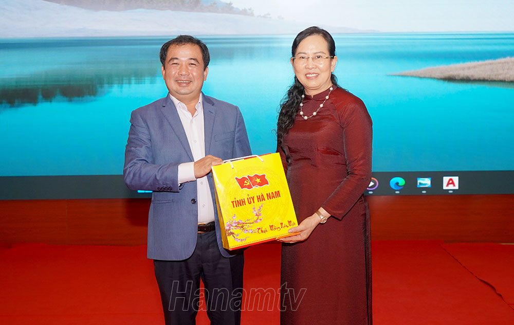Đồng chí Bí thư Tỉnh ủy Lê Thị Thủy trao quà lưu niệm của Tỉnh ủy Hà Nam tặng đồng chí Bí thư Tỉnh ủy Hải Dương Trần Đức Thắng.