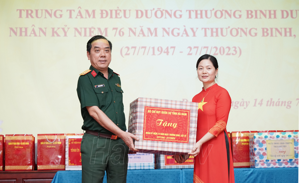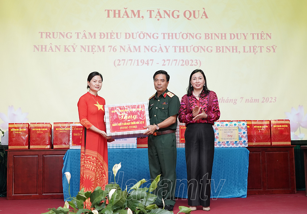 Thay mặt Tỉnh ủy - HĐND - UBND - Ủy ban MTTQ tỉnh, đồng chí Đinh Thị Lụa, Phó Bí thư Thường trực Tỉnh ủy tặng quà cho Trung tâm điều dưỡng Thương binh Duy TiênThay mặt Bộ Tư lệnh Quân khu 3, Thiếu tướng Hà Tất Đạt, Phó Tư lệnh Quân khu 3 tặng quà cho Trung tâm điều dưỡng Thương binh Duy TiênLãnh đạo Bộ Chỉ huy Quân sự tỉnh tặng quà cho Trung tâm điều dưỡng thương binh Duy TiênLãnh đạo Thị xã Duy Tiên tặng quà cho Trung tâm điều dưỡng Thương binh Duy Tiên