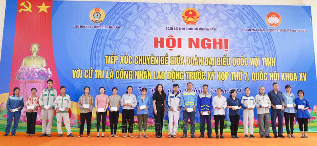 Cũng nhân dịp này, Đoàn ĐBQH tỉnh Hà Nam, Liên đoàn Lao động tỉnh đã trao tặng 100 suất quà cho công nhân lao động có hoàn cảnh khó khăn, mỗi suất trị giá 1 triệu đồng.