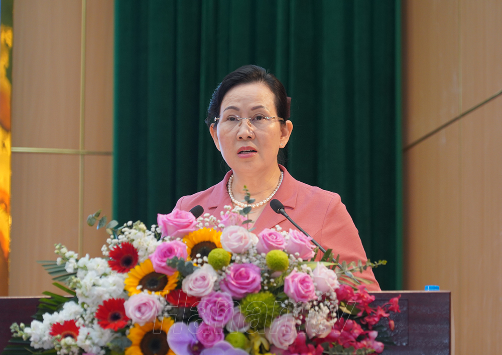 Đồng chí Lê Thị Thủy, Ủy viên TW Đảng, Bí thư Tỉnh ủy, Trưởng Đoàn ĐBQH tỉnh phát biểu tại hội nghị tiếp xúc cử tri huyện Lý Nhân