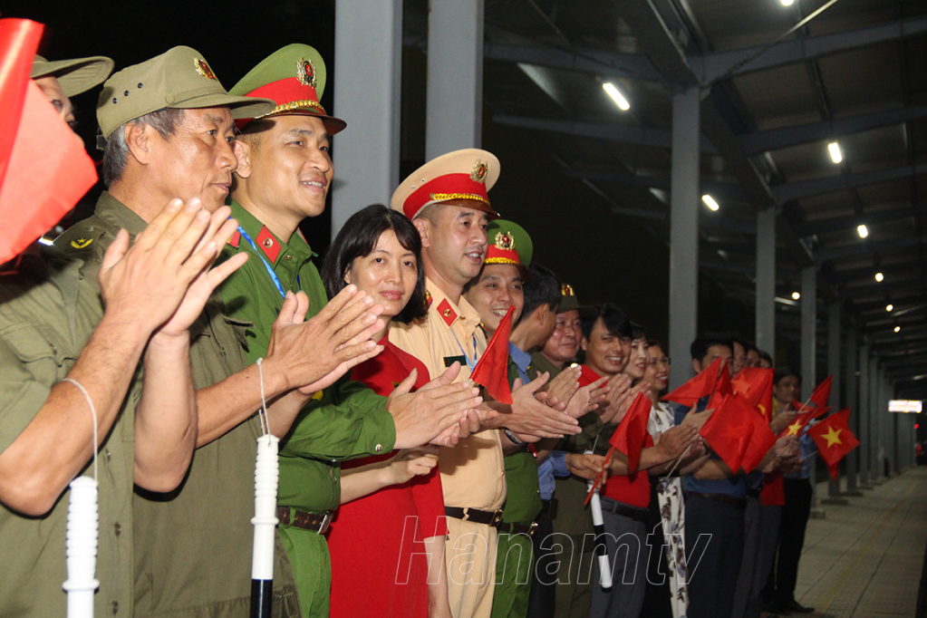 Đoàn tàu SE1 tiến vào sân ga trong sự chào đón nồng nhiệt của người dân Phủ Lý.