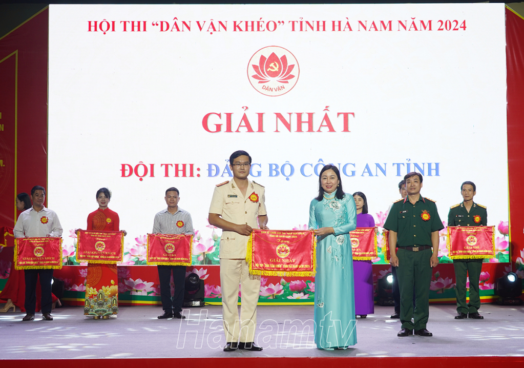Đồng chí Đinh Thị Lụa, Phó Bí thư Thường trực Tỉnh ủy, Trưởng Ban Chỉ đạo phong trào thi đua “Dân vận khéo” tỉnh, Trưởng Ban Tổ chức Hội thi “Dân vận khéo” tỉnh Hà Nam trao giải Nhất cho Đọi thi Đảng bộ Công an tỉnh.